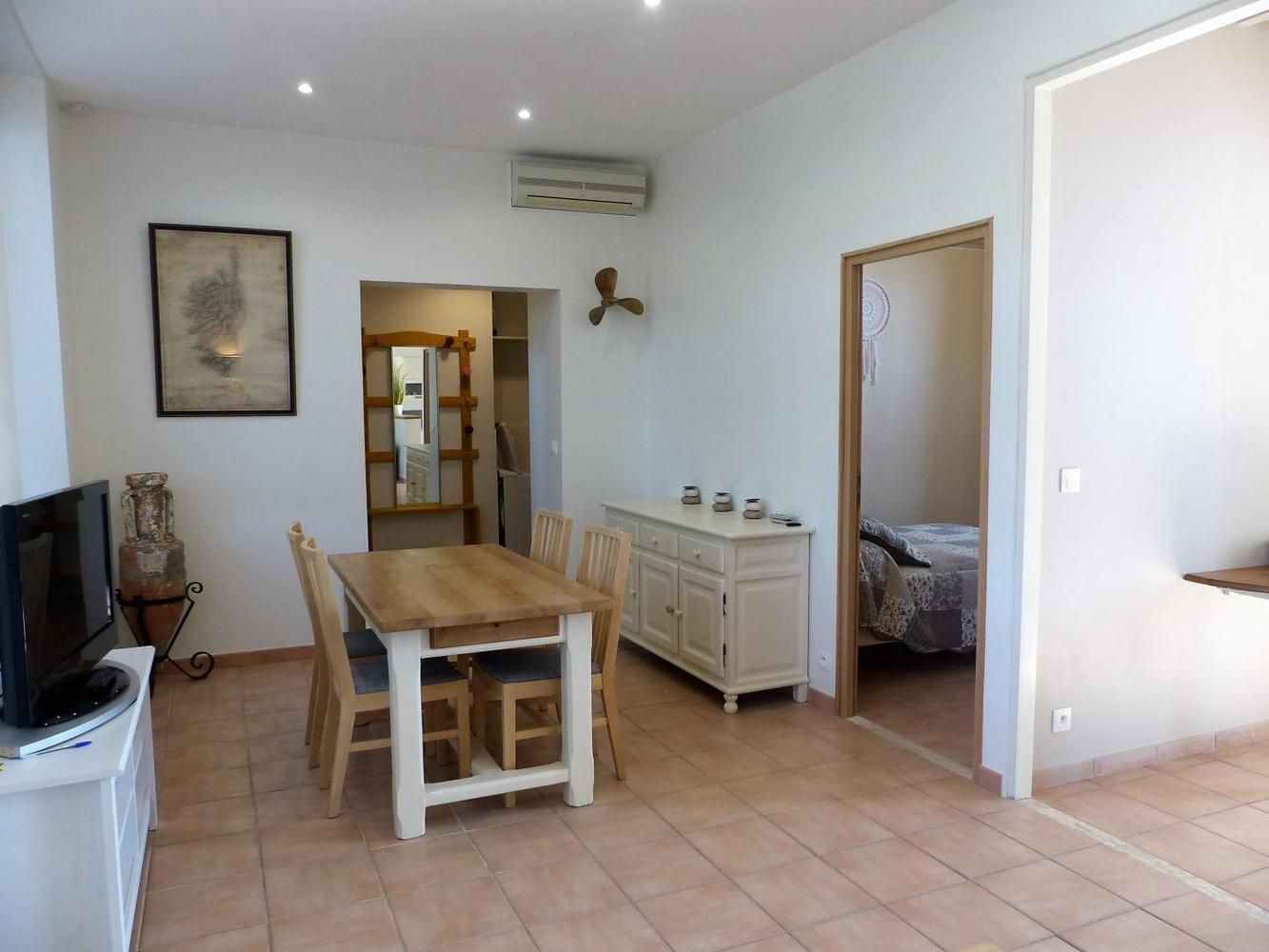 - Un séjour avec cuisine équipée ouverte sur le salon avec plaque 4 feux gaz, hotte, micro-ondes, four, lave-vaisselle, réfrigérateur/congélateur et cafetière à percolateur. Salon avec canapé d'angle convertible (possibilité de 2 couchages d'appoint supplémentaires) et TV écran plat 80cm. Espace repas pour 4 personnes. - Une chambre avec un lit 2 personnes 140x190cm et penderie.
