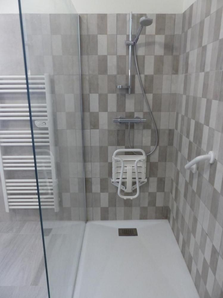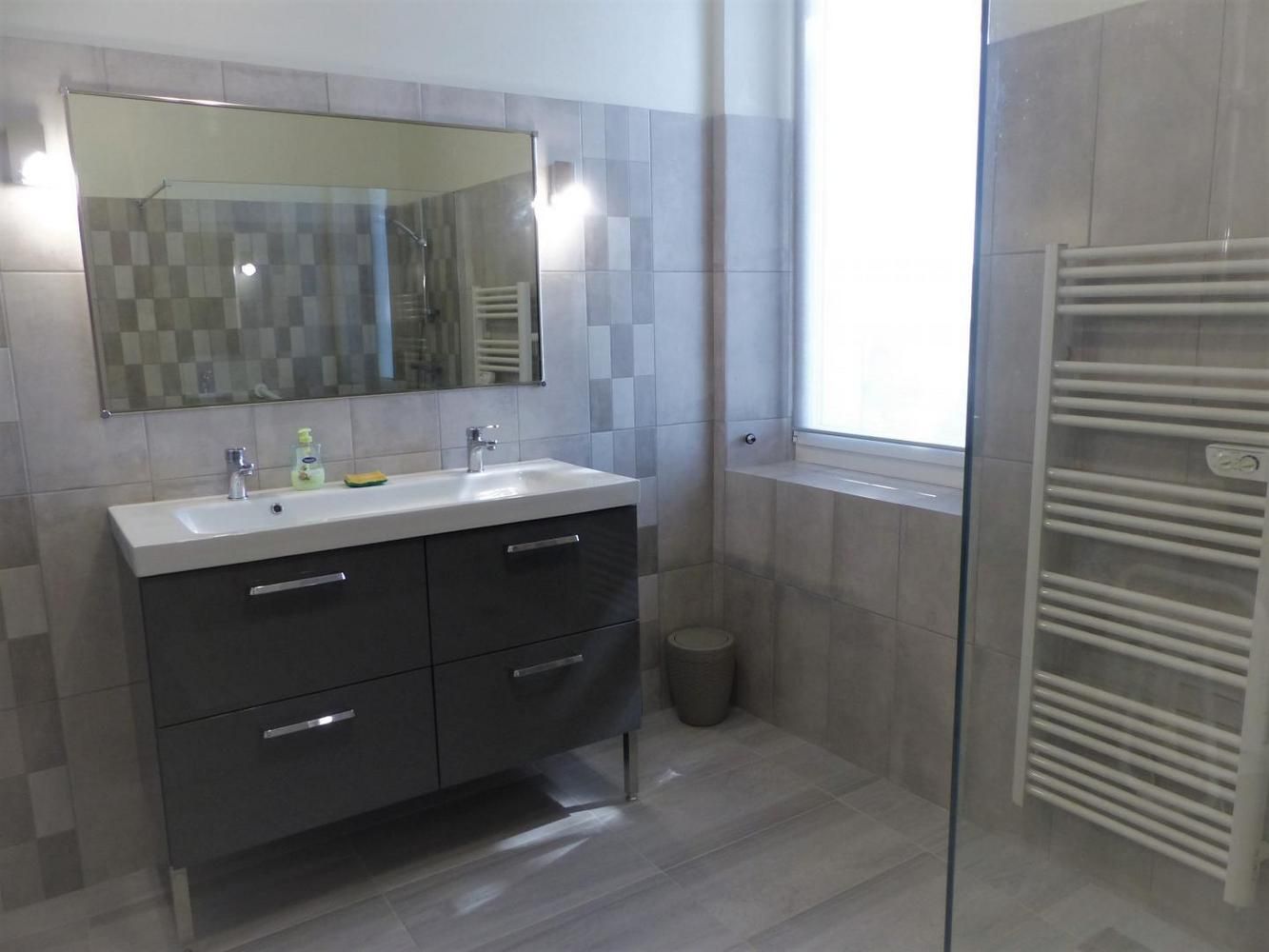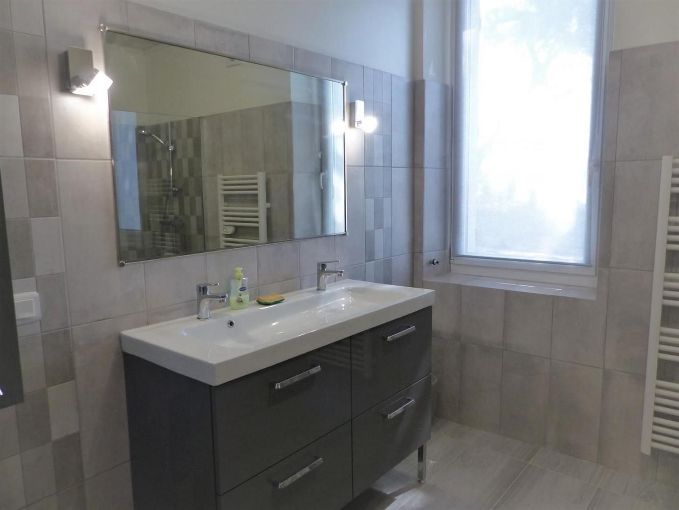 - Grande salle d'eau avec douche à l'italienne 90x160cm antidérapante, siège de douche et barre d'appui, double vasque et porte-serviettes chauffant.