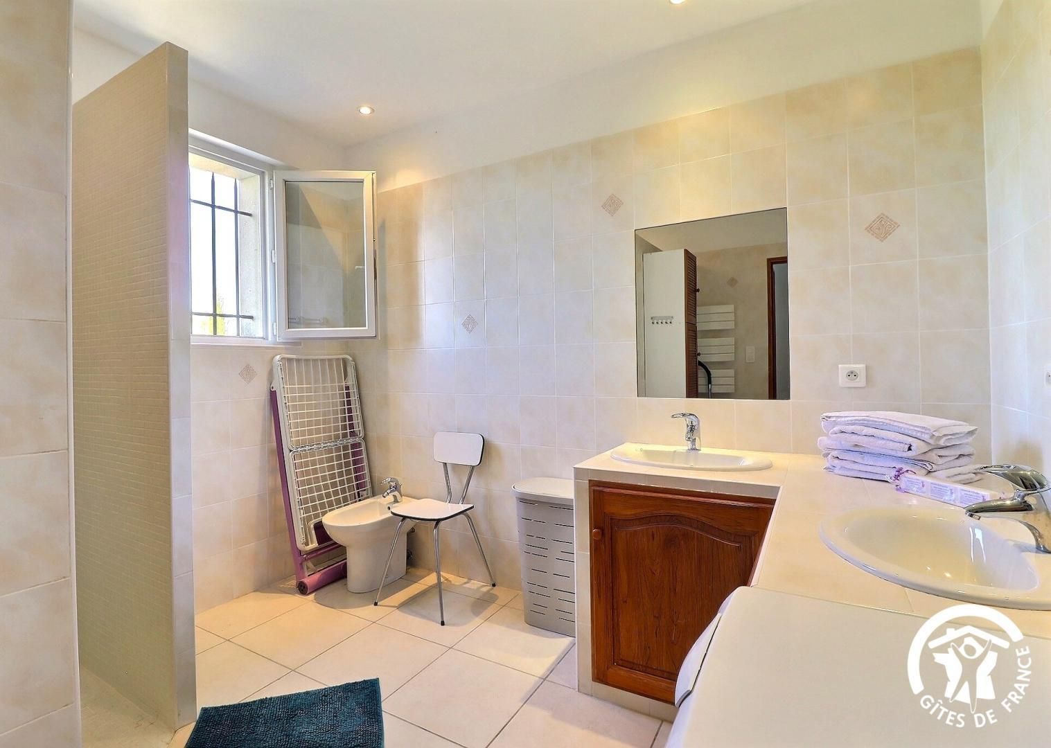 - Salle d'eau avec douche à l'italienne de grande dimension avec siège (largeur adaptée pour un fauteuil roulant), double vasque, bidet, porte-serviettes chauffant et lave-linge.