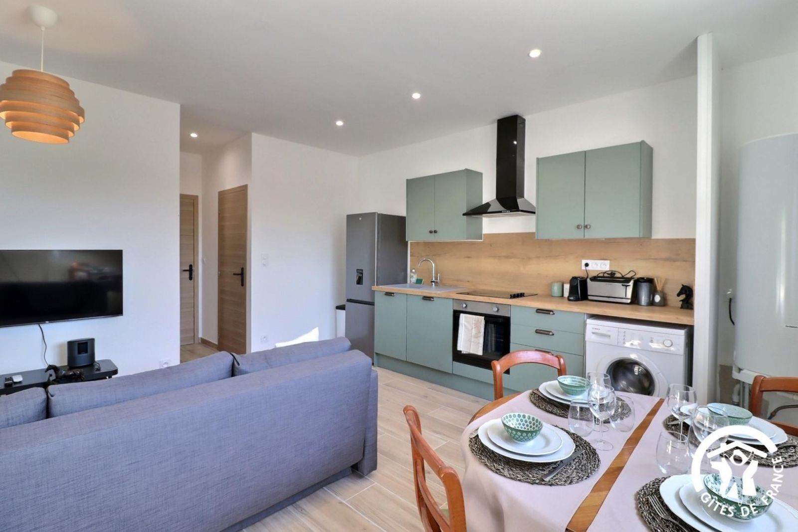 - une pièce de vie avec canapé convertible 140x190, tables basses, TV connectée, table et 4 chaises, cuisine équipée (réfrigérateur-congélateur, plaque de cuisson vitrocéramique 4 feux, machine à café, grille-pain, bouilloire, lave-vaisselle, four et machine à laver)