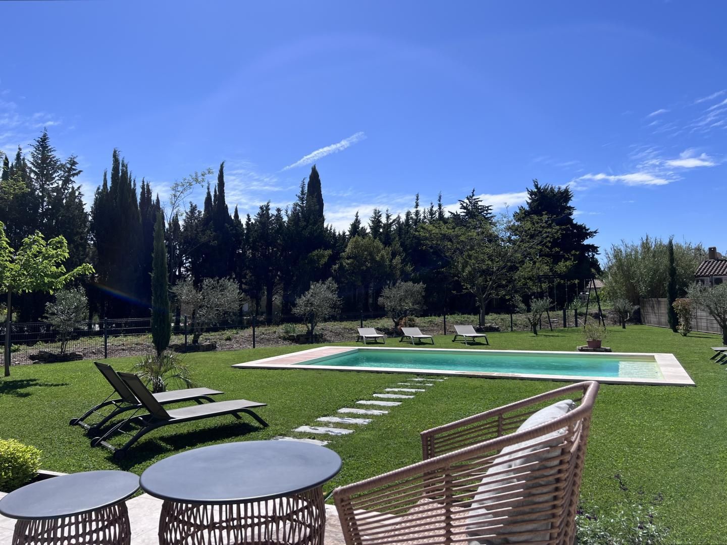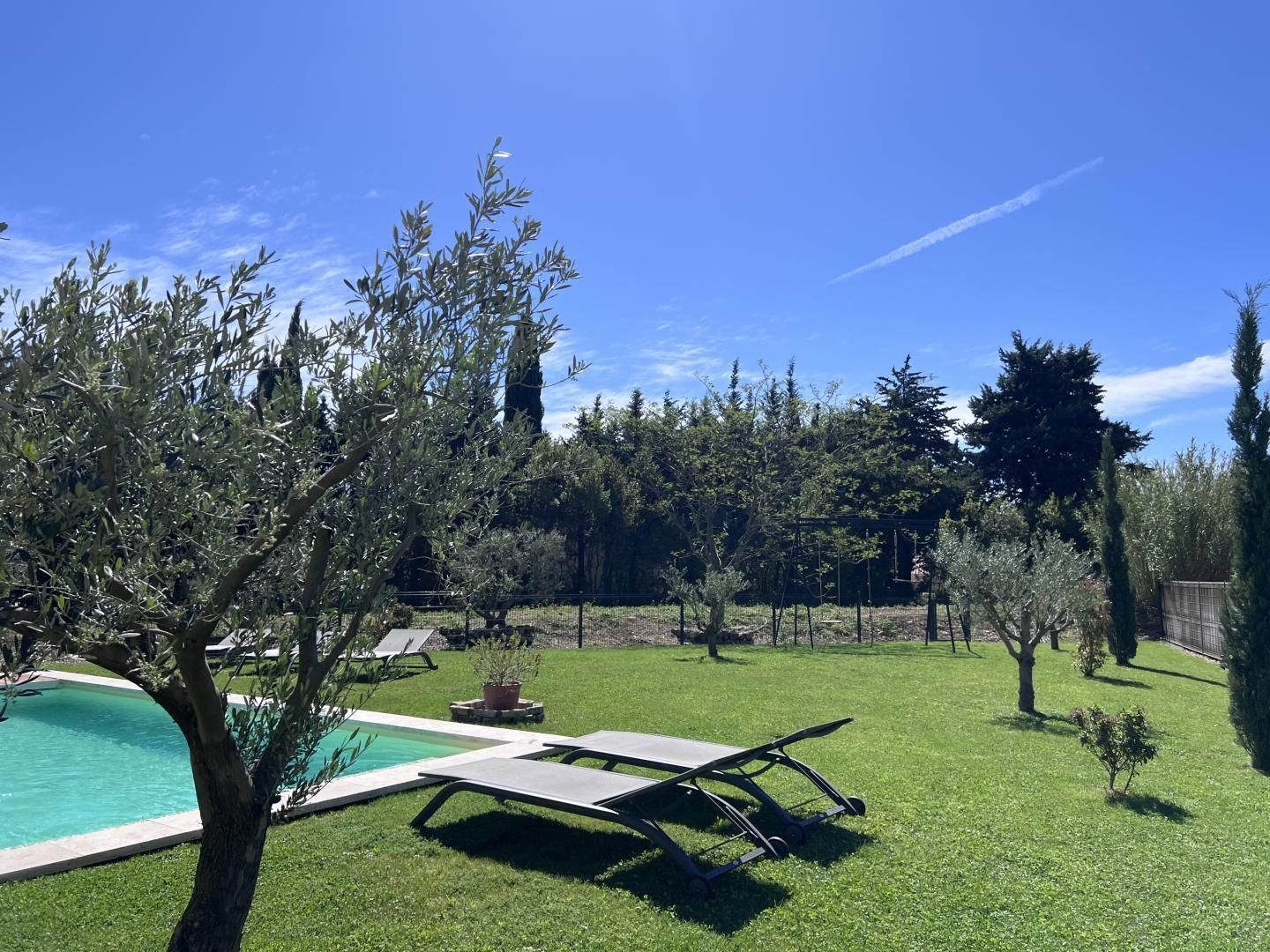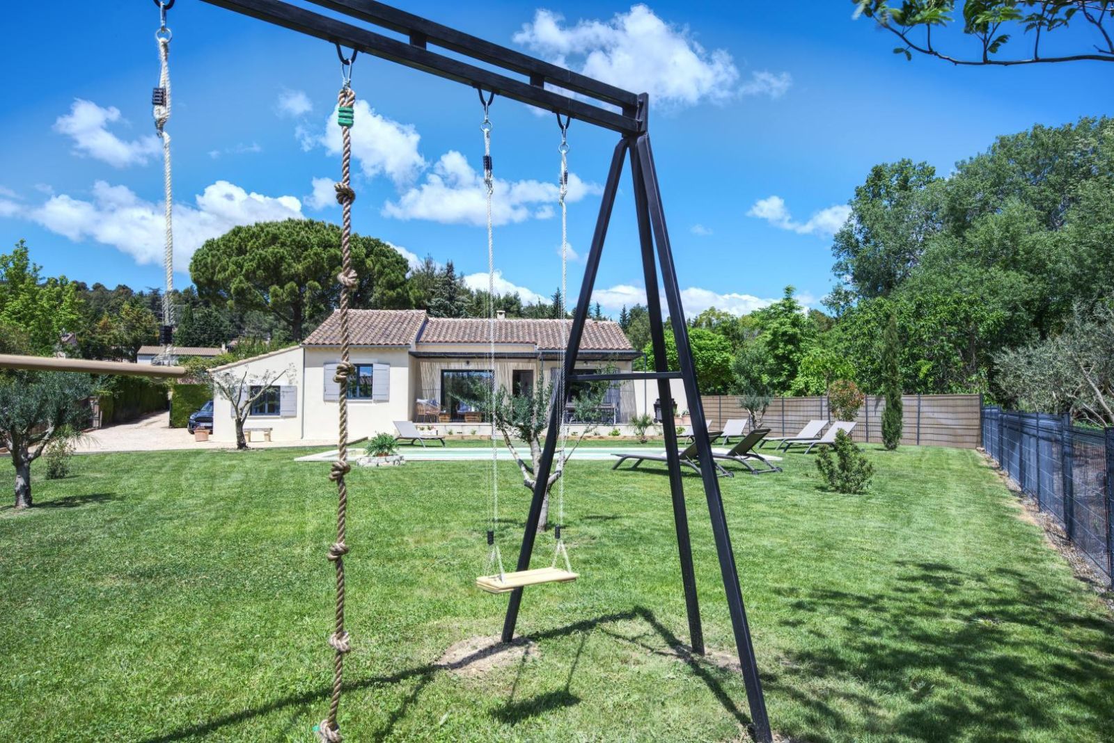 À l'extérieur, le jardin offre une balançoire, la piscine privative et plusieurs arbres Provençaux. La maison est équipée du wifi et d'une climatisation gainable réversible avec thermostat individuel dans chaque chambre. L'électricité est incluse jusqu'à 8 kW par jour. Les animaux sont acceptés. Draps, linge de toilette et ménage inclus.