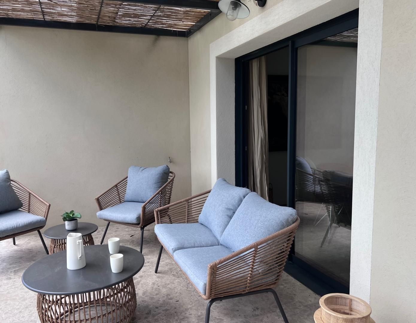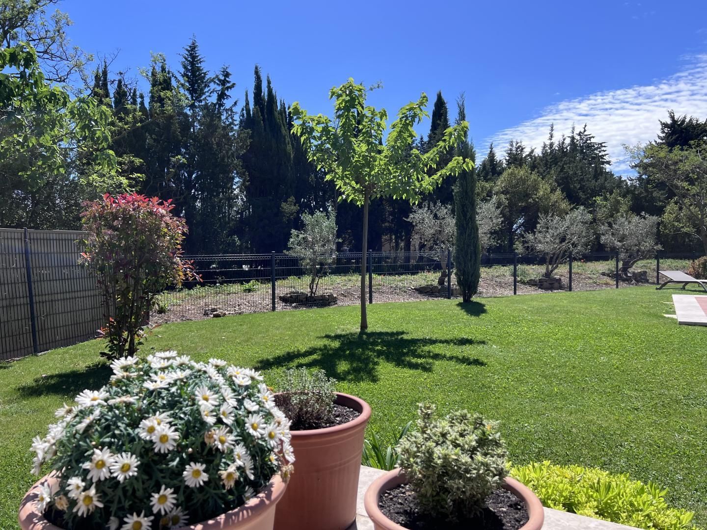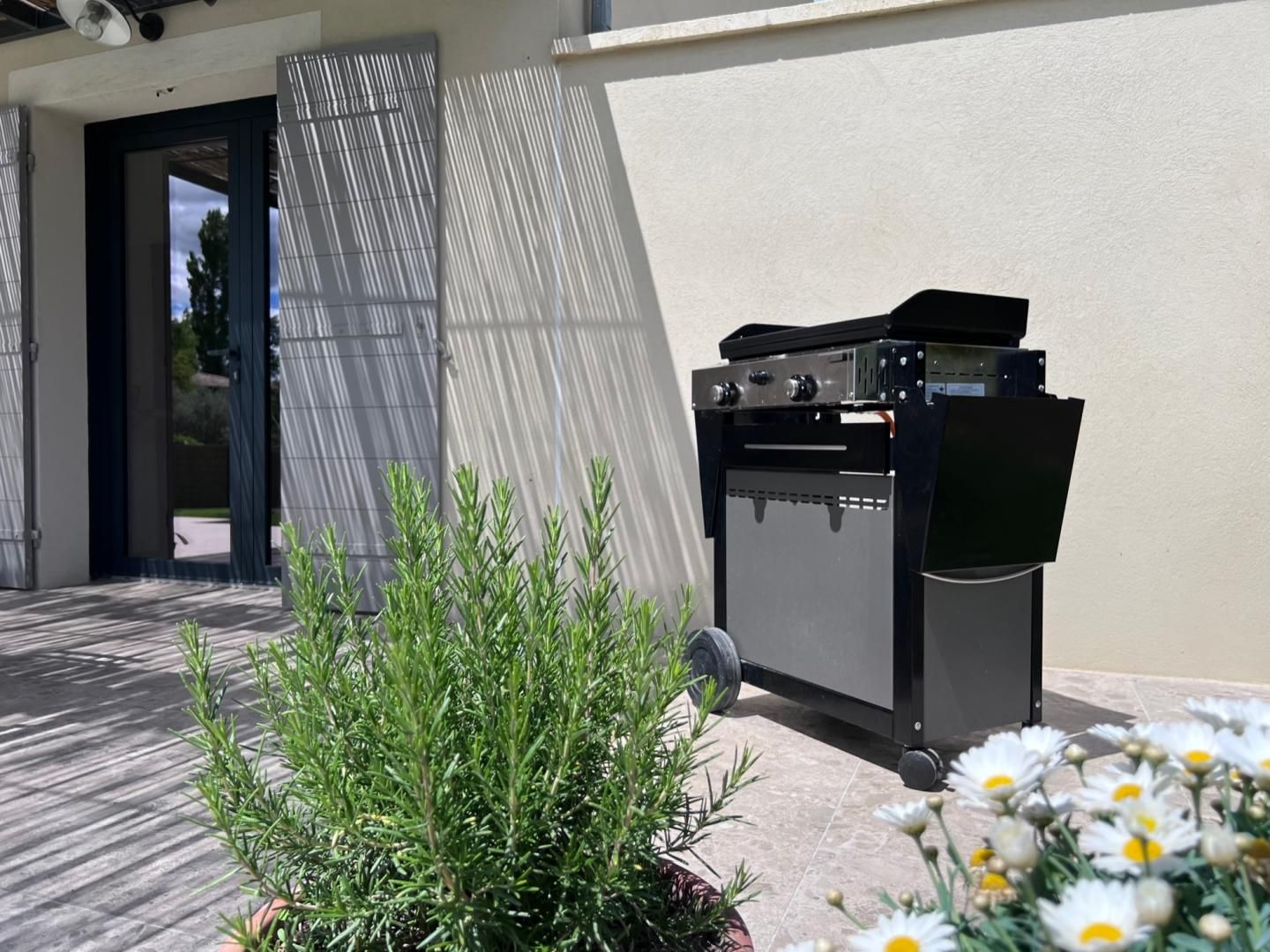 La propriété est entièrement clôturée et sécurisée par un portail. L'accès à la maison se fait par une agréable terrasse équipée d'une pergola, d'un salon de jardin, d'un espace détente et d'une plancha. De là, vous profiterez d'une vue sur le jardin arboré et la piscine privée (9x4 m, profondeur 1,70 m), sécurisée par un volet roulant et ouverte d'avril à mi-octobre.