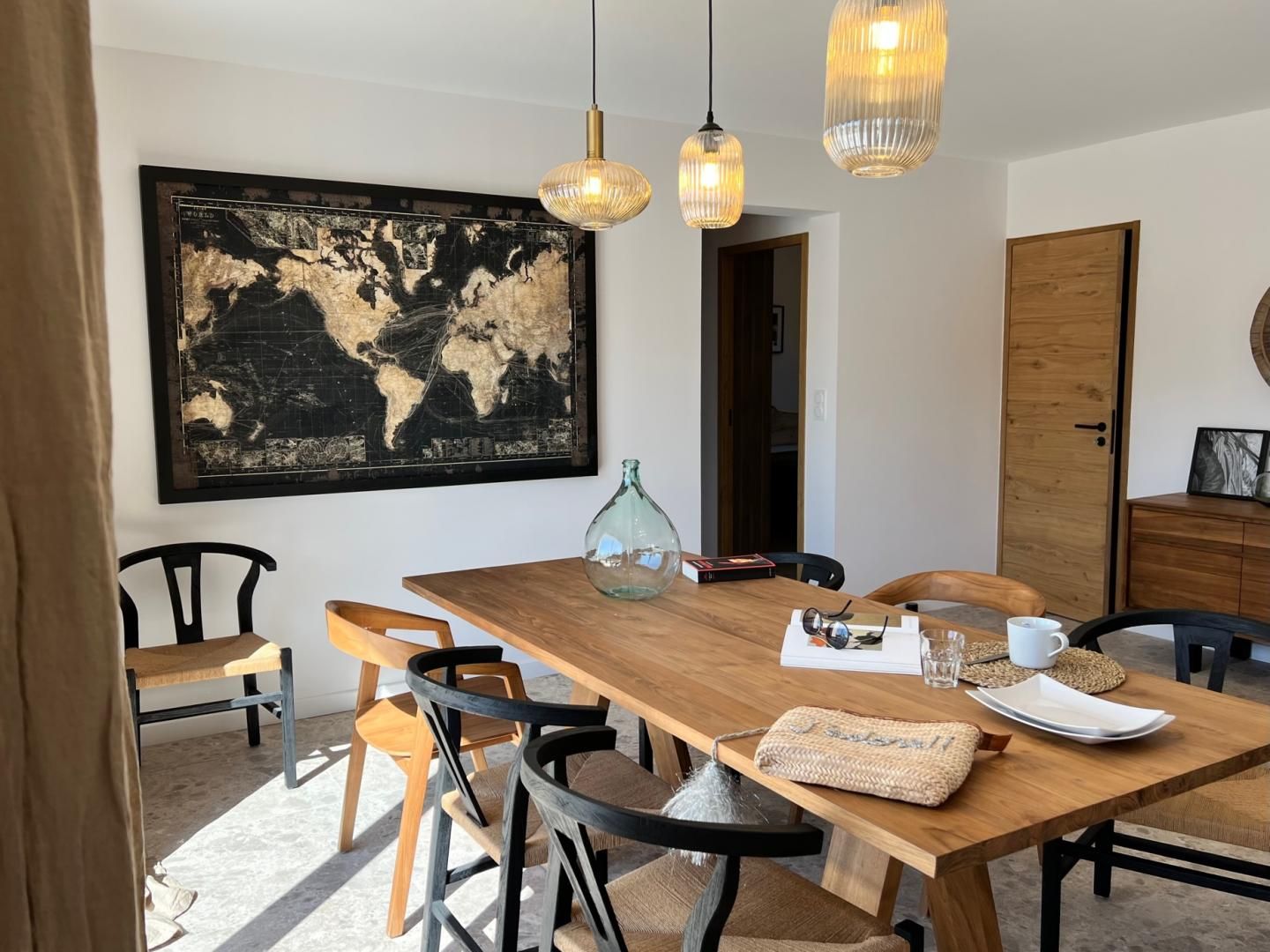 Une salle à manger avec une grande table en bois et huit chaises, ainsi qu'une commode et un placard de rangement.