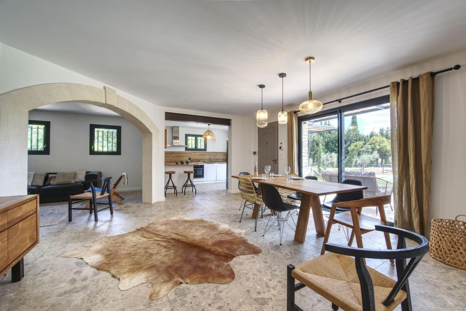 La vaste pièce à vivre se compose de trois espaces distincts :