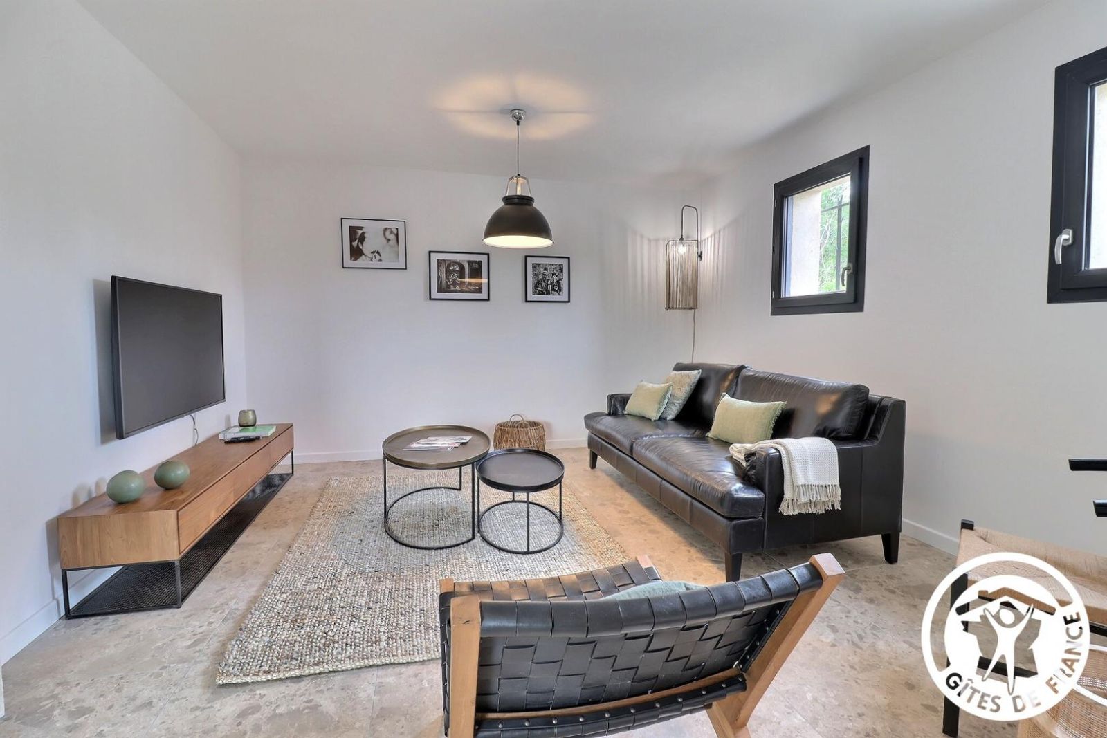 Un salon avec un grand téléviseur à écran plat connecté, un canapé en cuir, des fauteuils et une table basse.