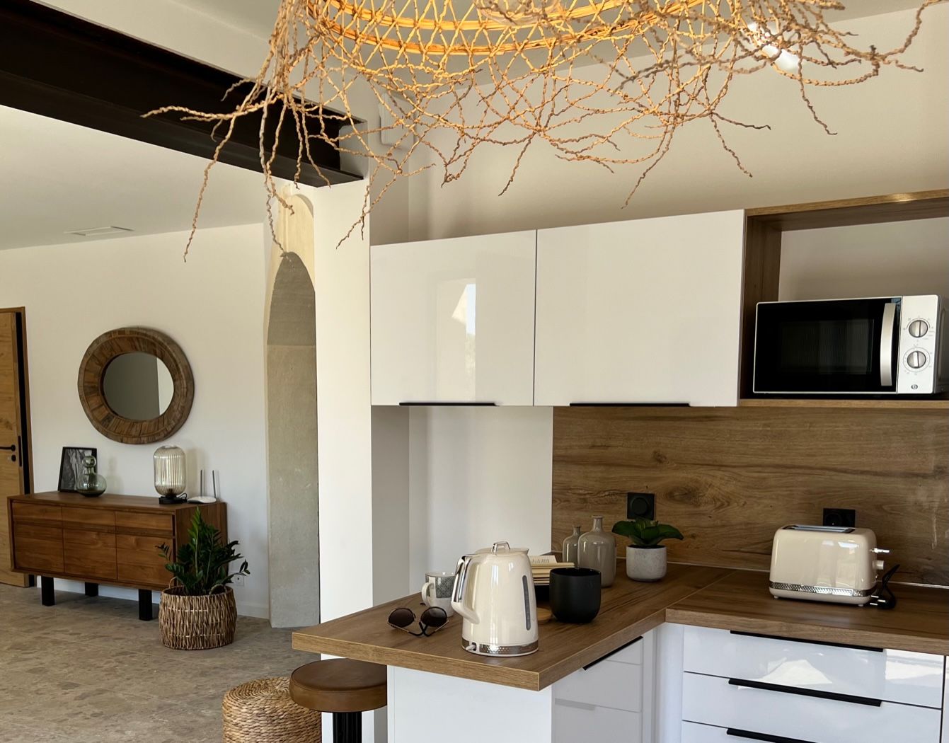Une cuisine équipée comprenant un four, une plaque à induction 4 feux, une hotte aspirante, un micro-ondes, un lave-vaisselle, un lave-linge et un réfrigérateur-congélateur.