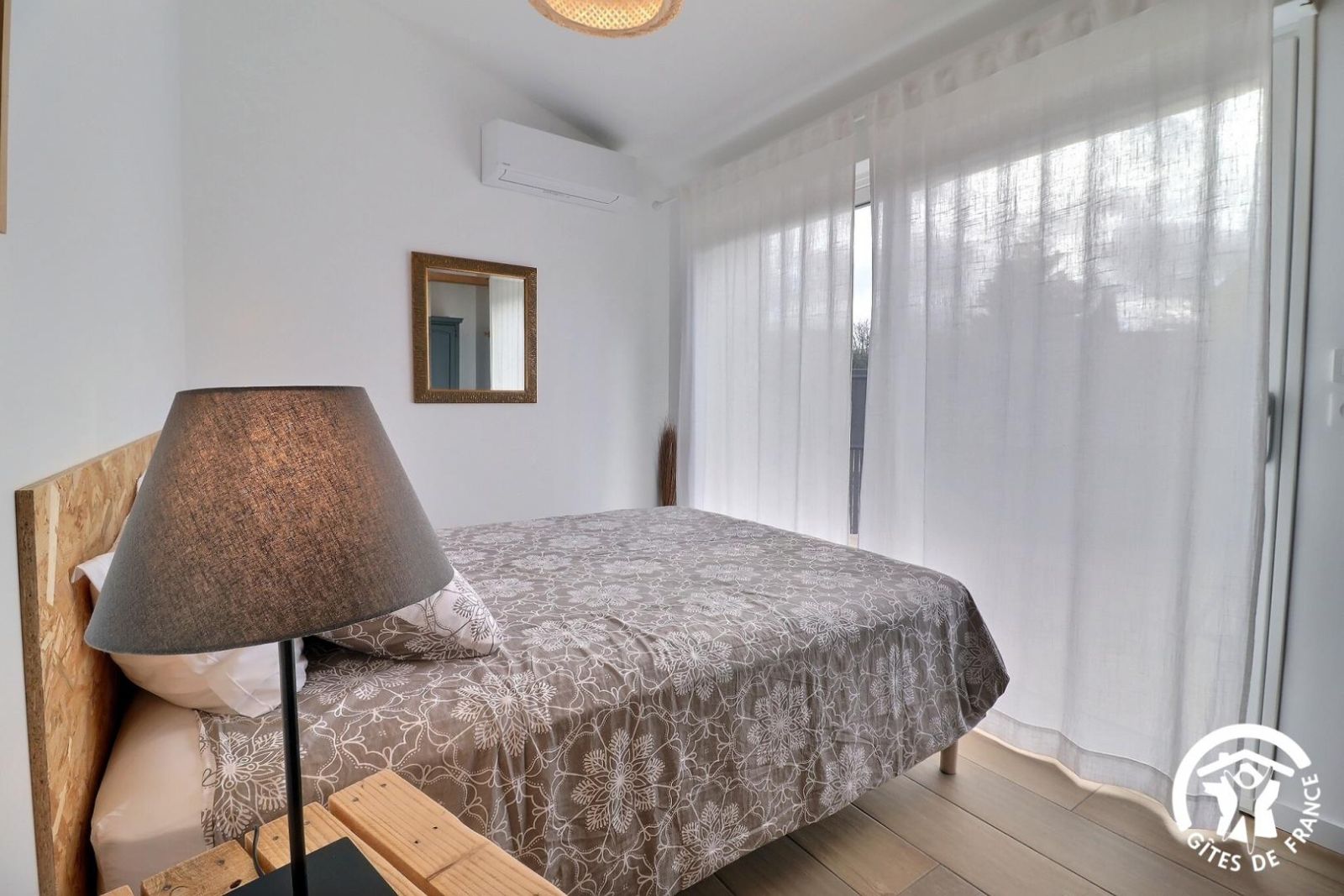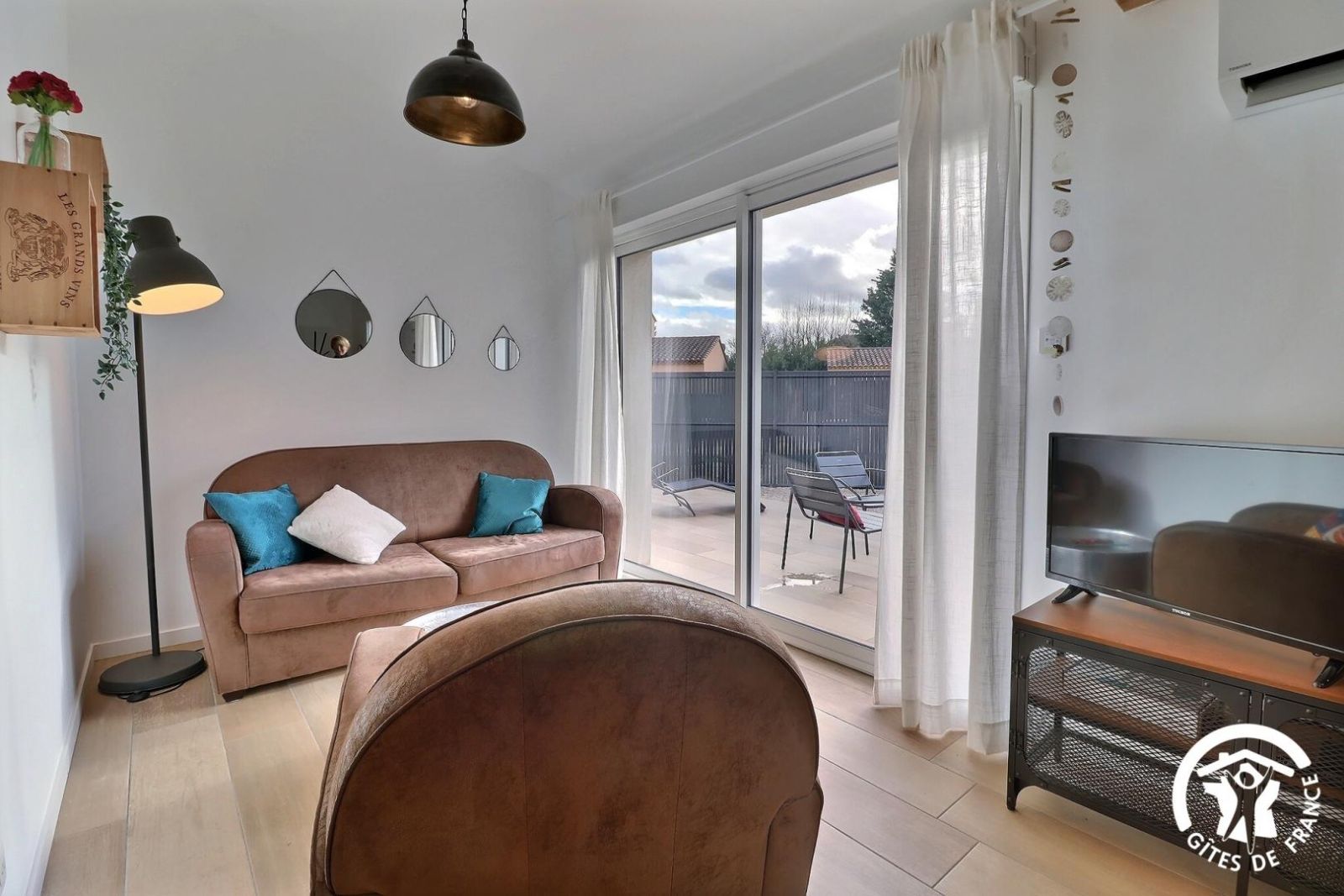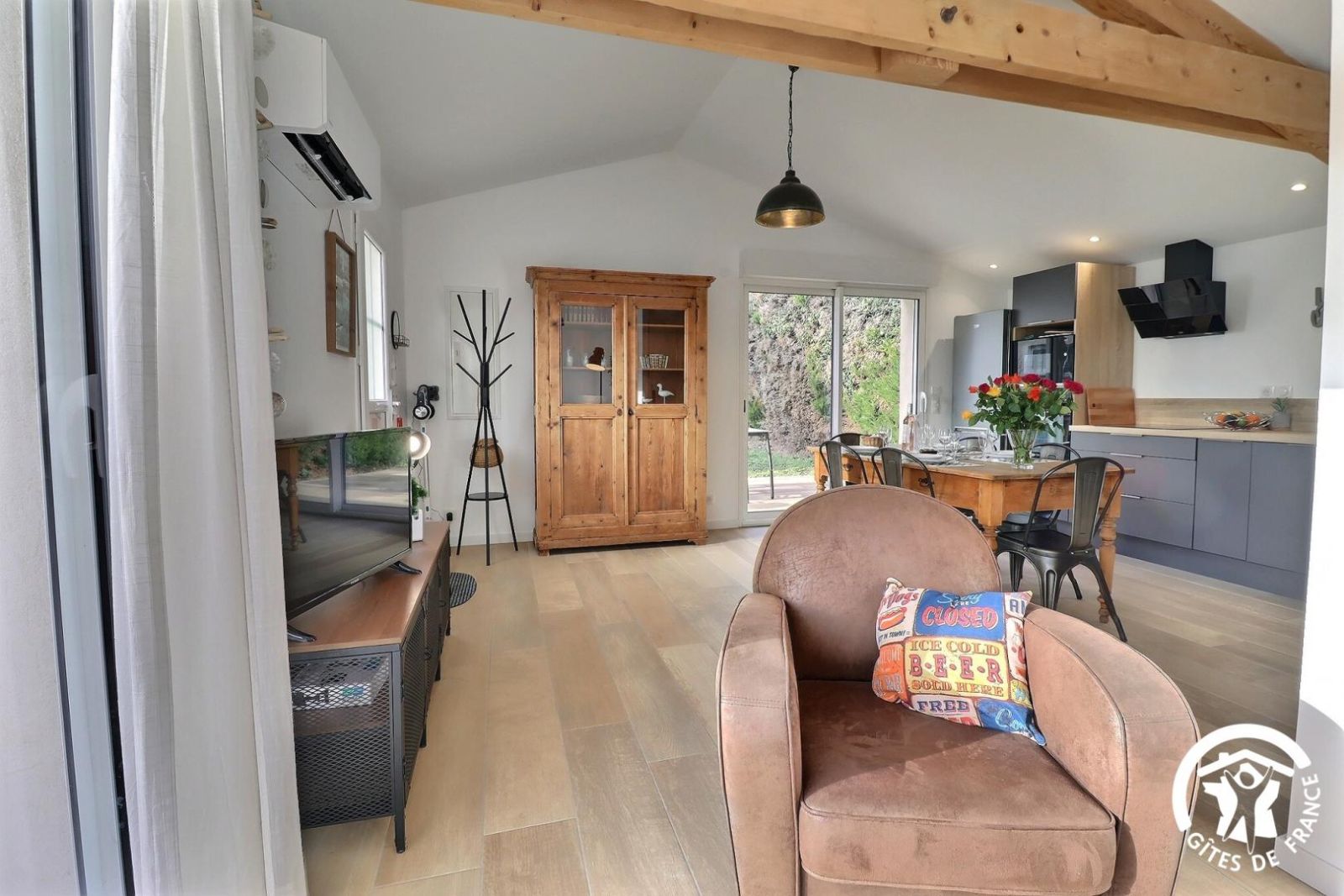 Il est situé dans un quartier résidentiel, au bout d'un chemin avec 3 autres maisons (dont celle des propriétaires). A l'extérieur, il dispose de deux places de parking privatives, d'une terrasse de 50m² avec salon de jardin et de détente, un barbecue et un jardin de 200m² arboré. A l'intérieur, de plain-pied, le gîte est composé :