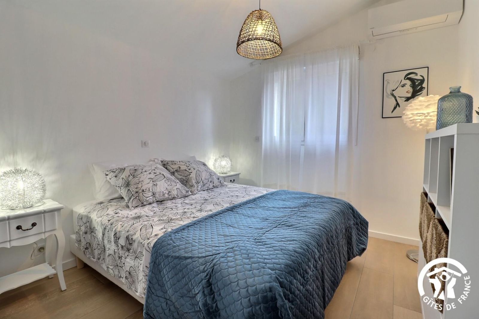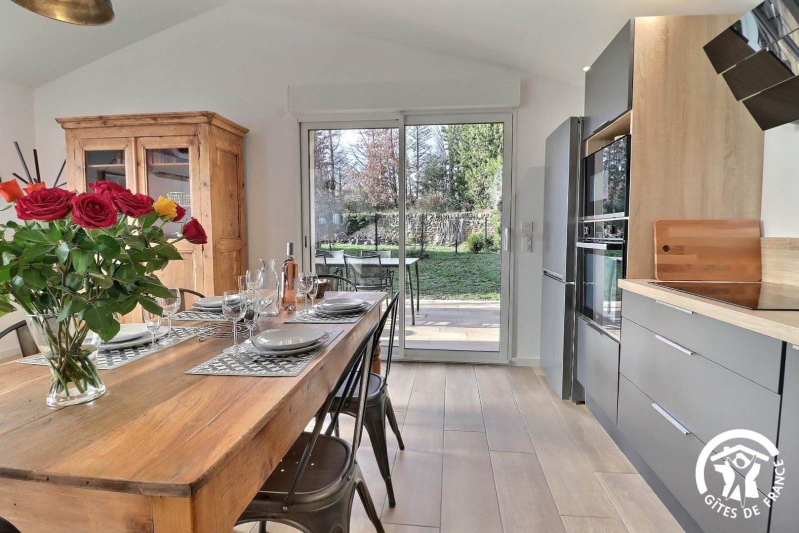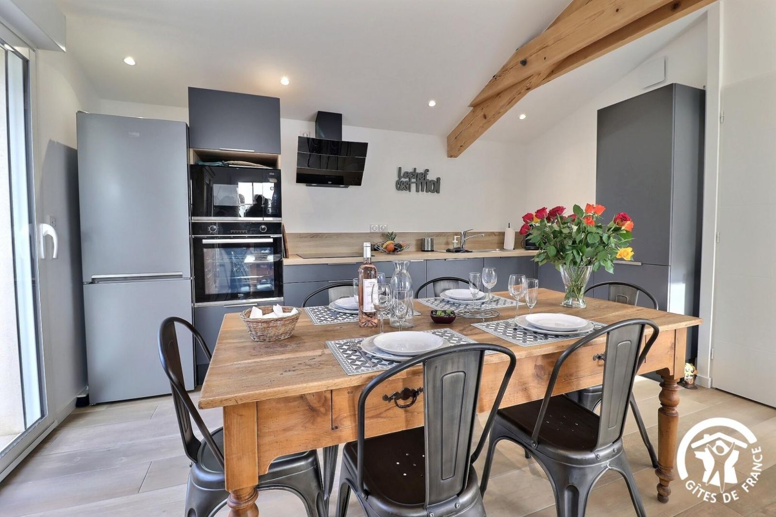 Il est situé dans un quartier résidentiel, au bout d'un chemin avec 3 autres maisons (dont celle des propriétaires). A l'extérieur, il dispose de deux places de parking privatives, d'une terrasse de 50m² avec salon de jardin et de détente, un barbecue et un jardin de 200m² arboré. A l'intérieur, de plain-pied, le gîte est composé :