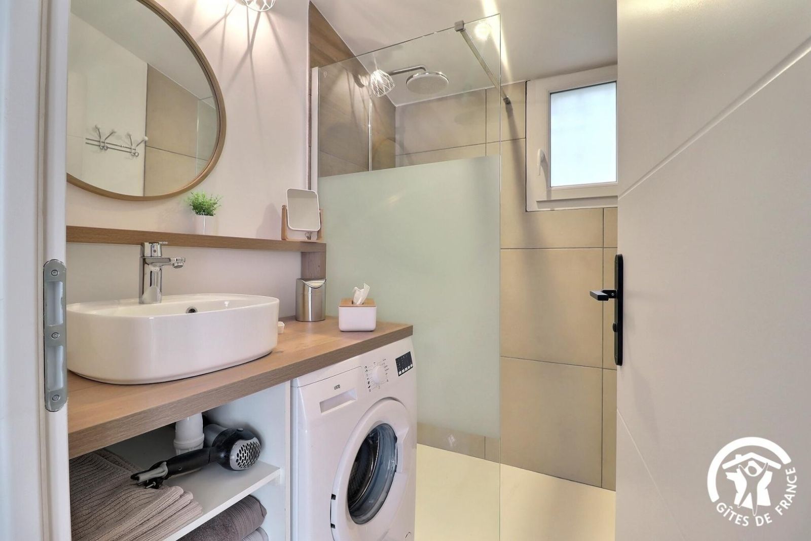 - d'une salle d'eau avec douche type italienne avec paroi en verre, vasque avec étagères sous vasque et lave-linge.