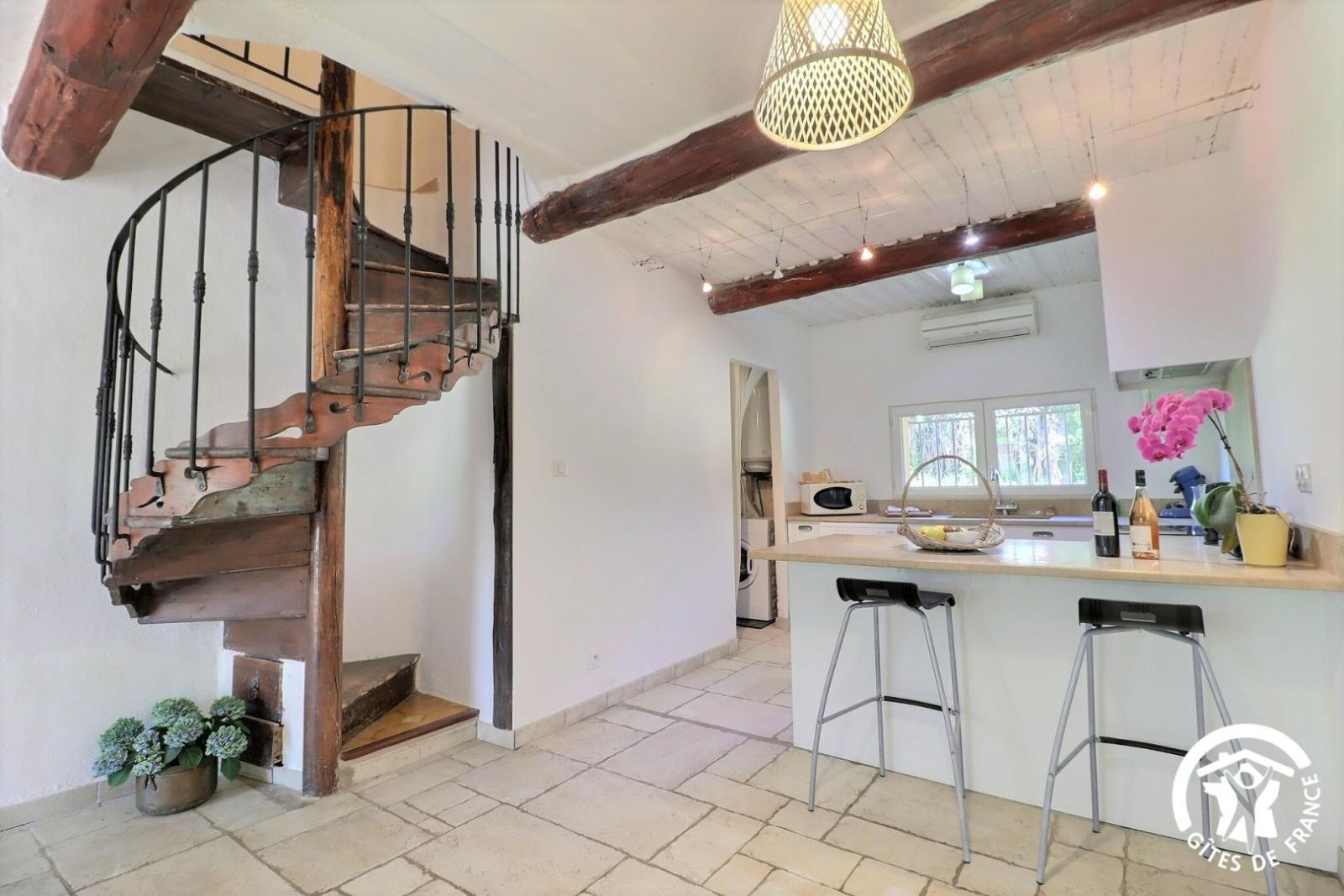 - Cuisine traversante avec espace repas pour 7 personnes, cheminée d'ornement, congélateur et accès direct à la terrasse. Cuisine équipée avec plan de travail en pierre d'Egypte, 3 feux induction, hotte, four, micro-ondes, lave-vaisselle. - Buanderie avec réfrigérateur, lave-linge et ustensiles de ménage. Au 1er étage, accessible via un bel escalier en colimaçon ancien :