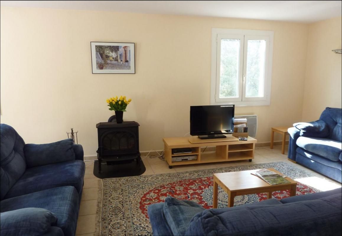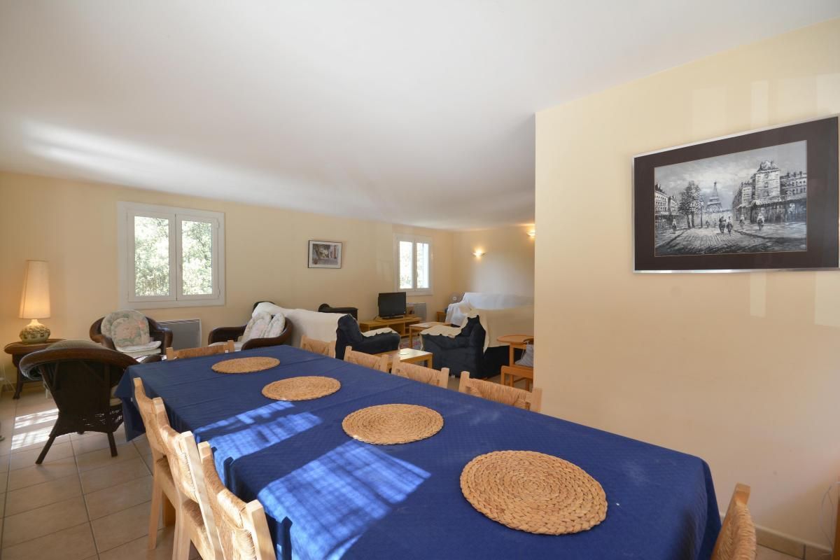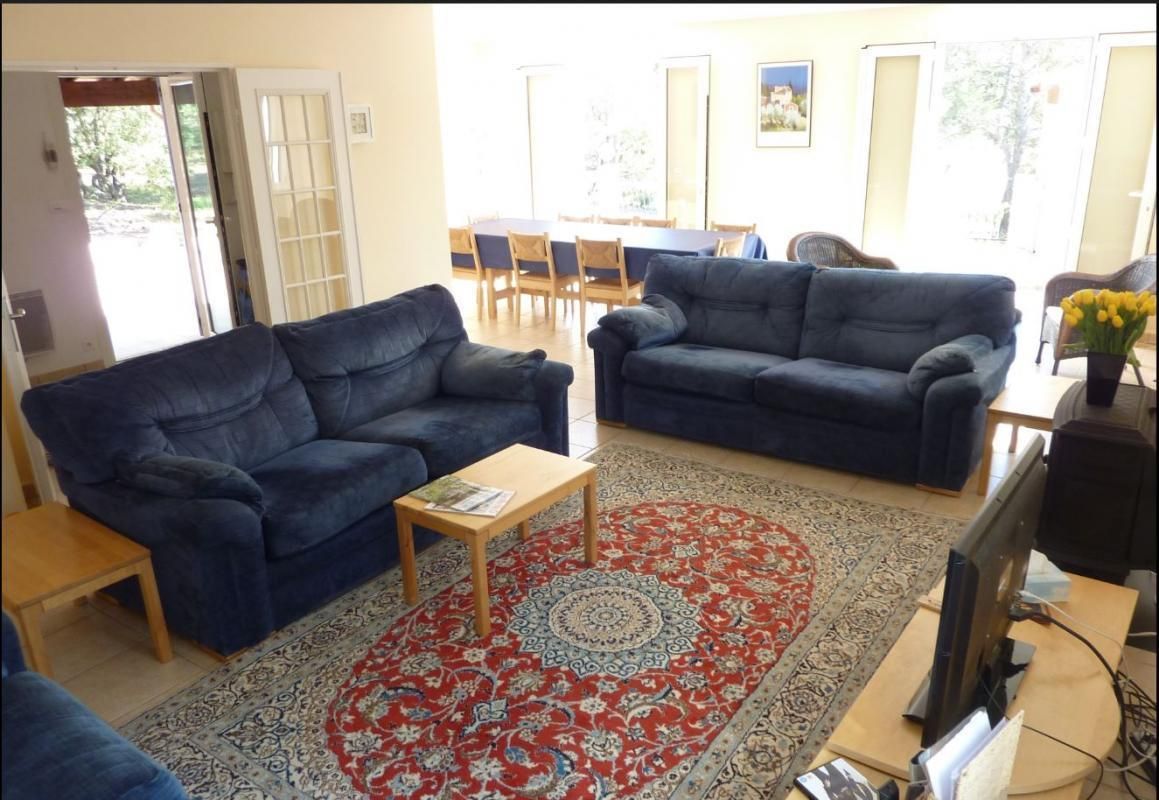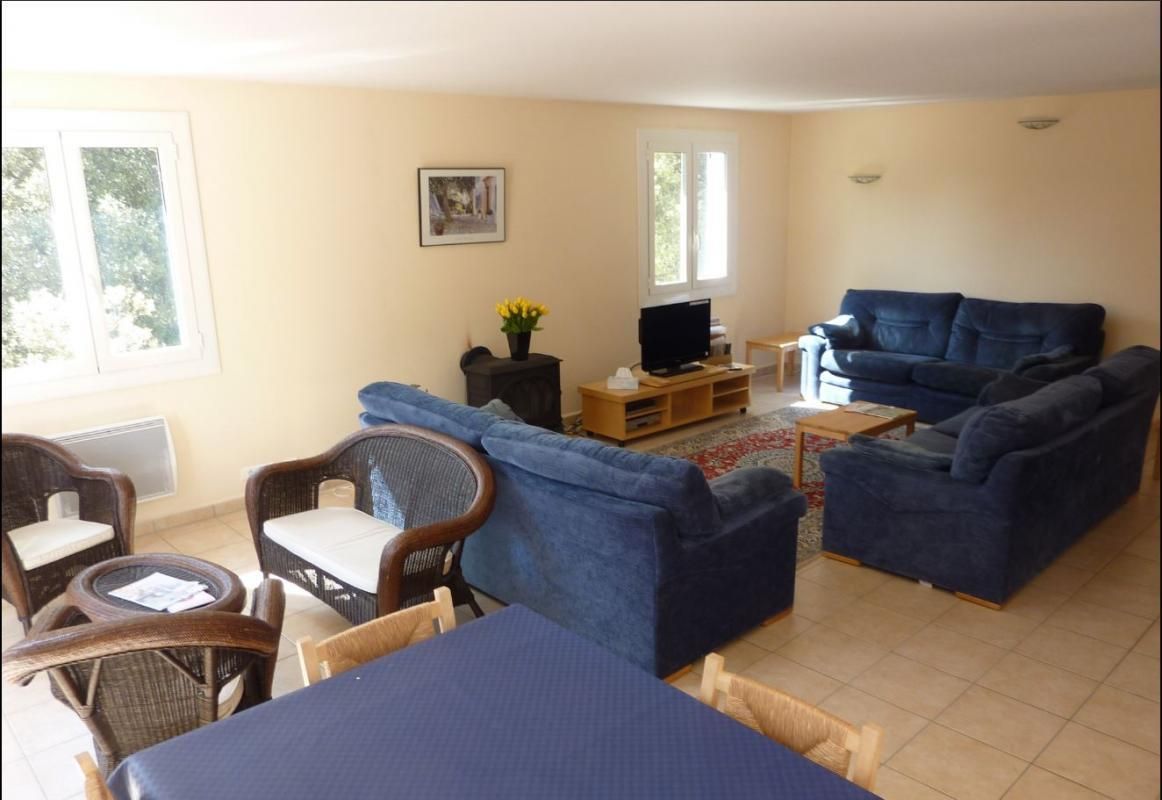 Vaste pièce de jour de 45 m² avec espace repas et 2 coins salons : un premier espace avec canapés, TV écran plat (chaîne hifi et radio intégrées), lecteur DVD et poële à bois et un second espace avec fauteuils et table basse. De nombreux livres, DVD et jeux sont à disposition (notamment en anglais).