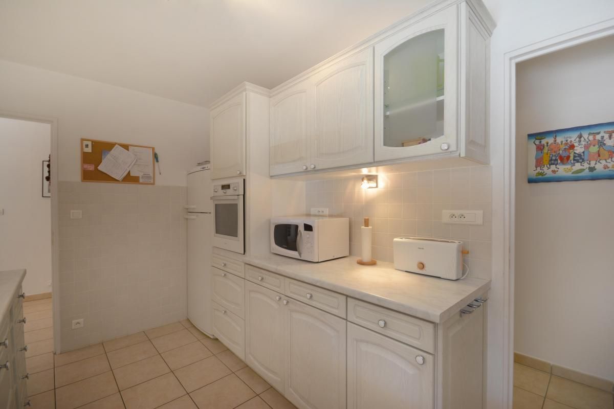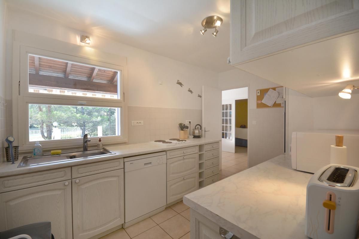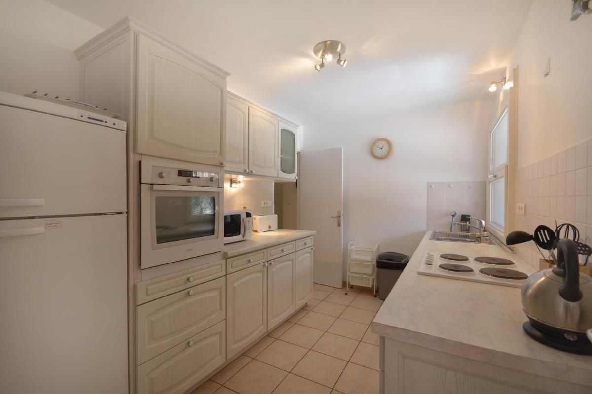 Cuisine séparée avec plaque vitrocéramique, four, micro-ondes et lave-vaisselle.