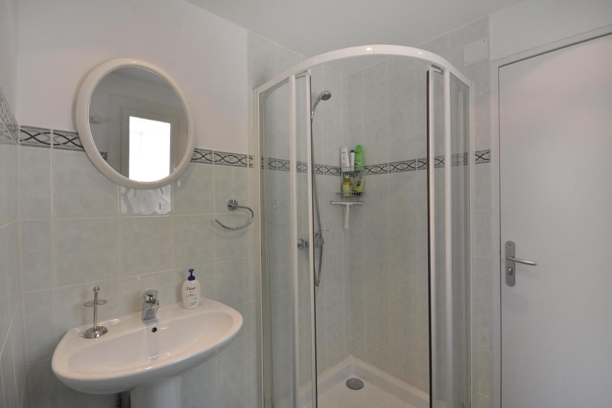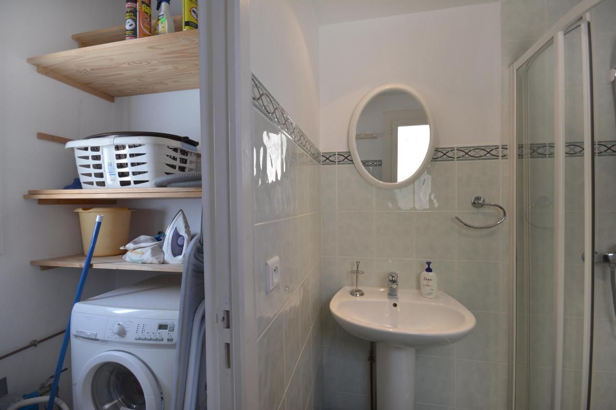 Une salle d'eau avec douche d'angle, donnant accès à la buanderie avec le lave-linge..