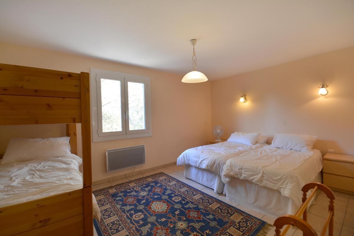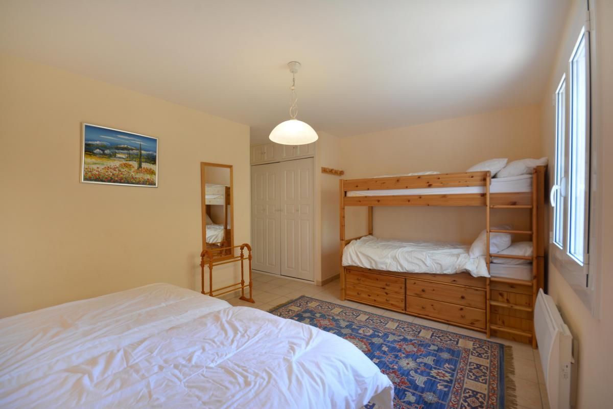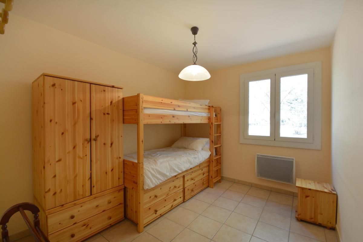 - 1 grande chambre avec 2 lits 1 personne 90x190cm jumelables et 2 lits superposés 90x190cm