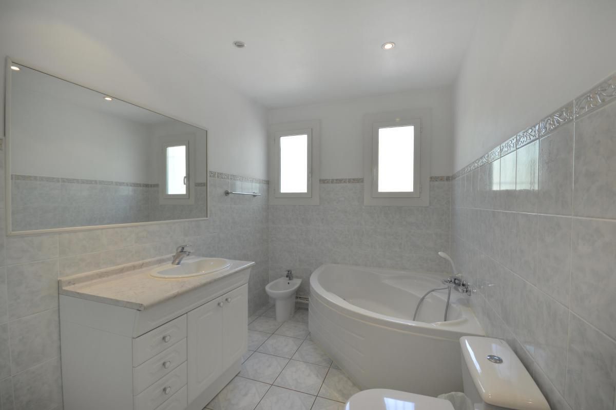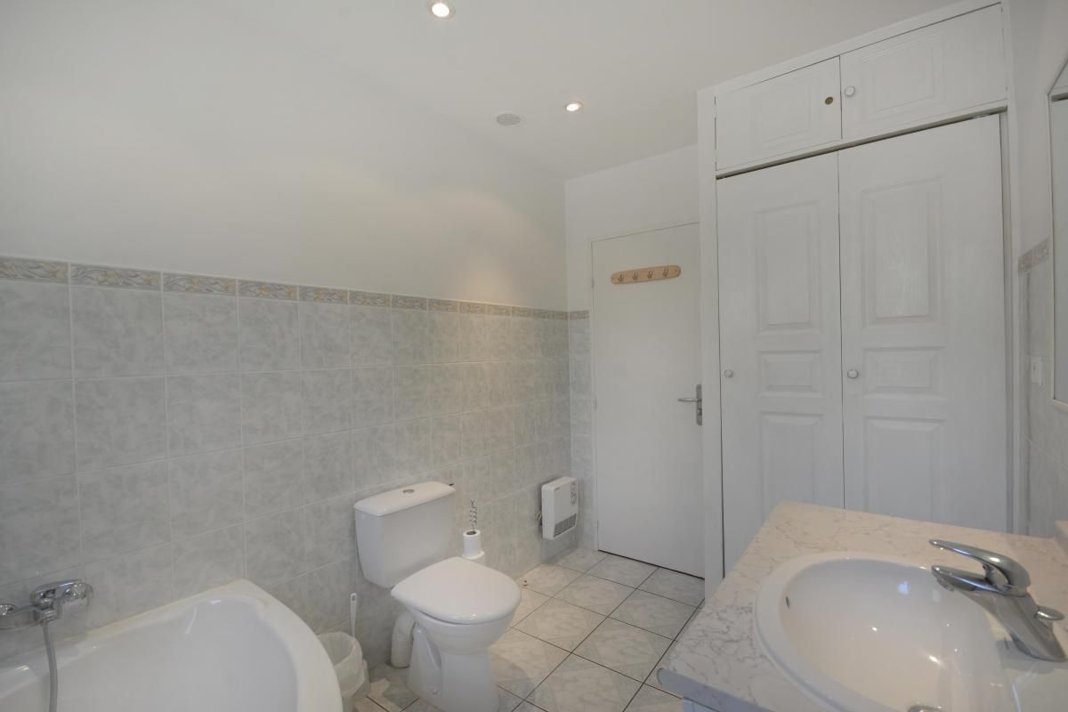 Une salle de bain avec baignoire d'angle.