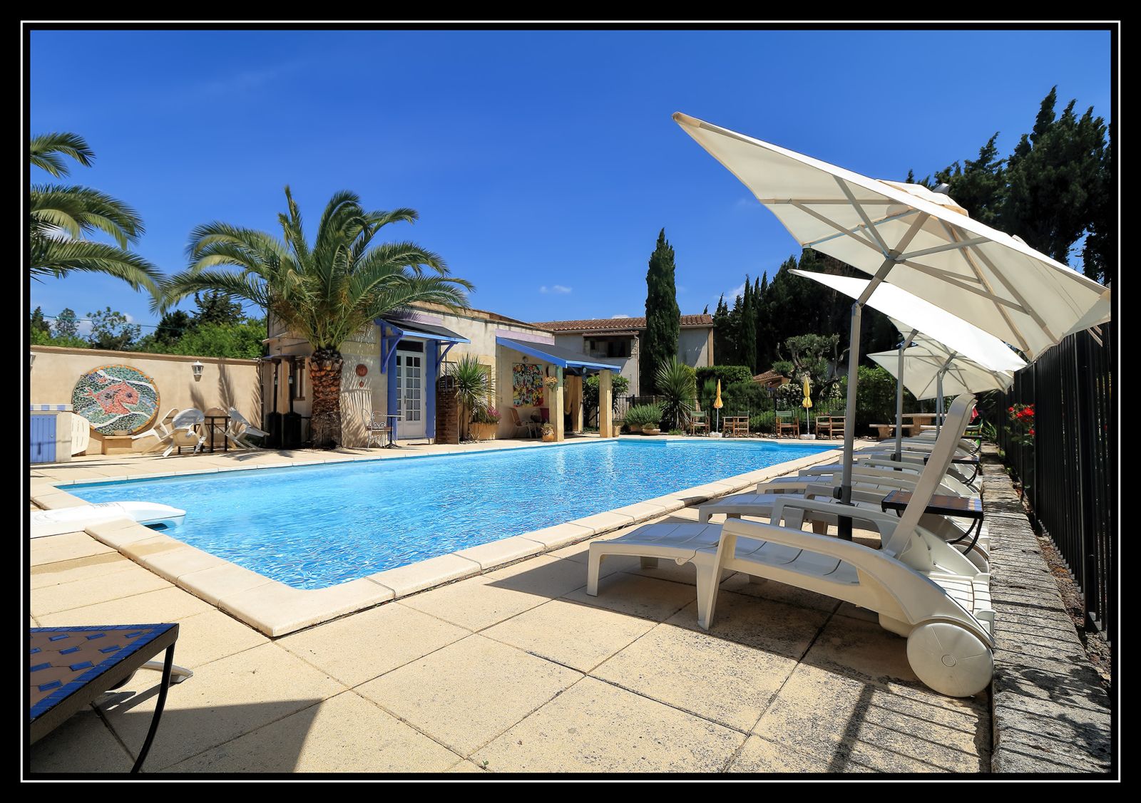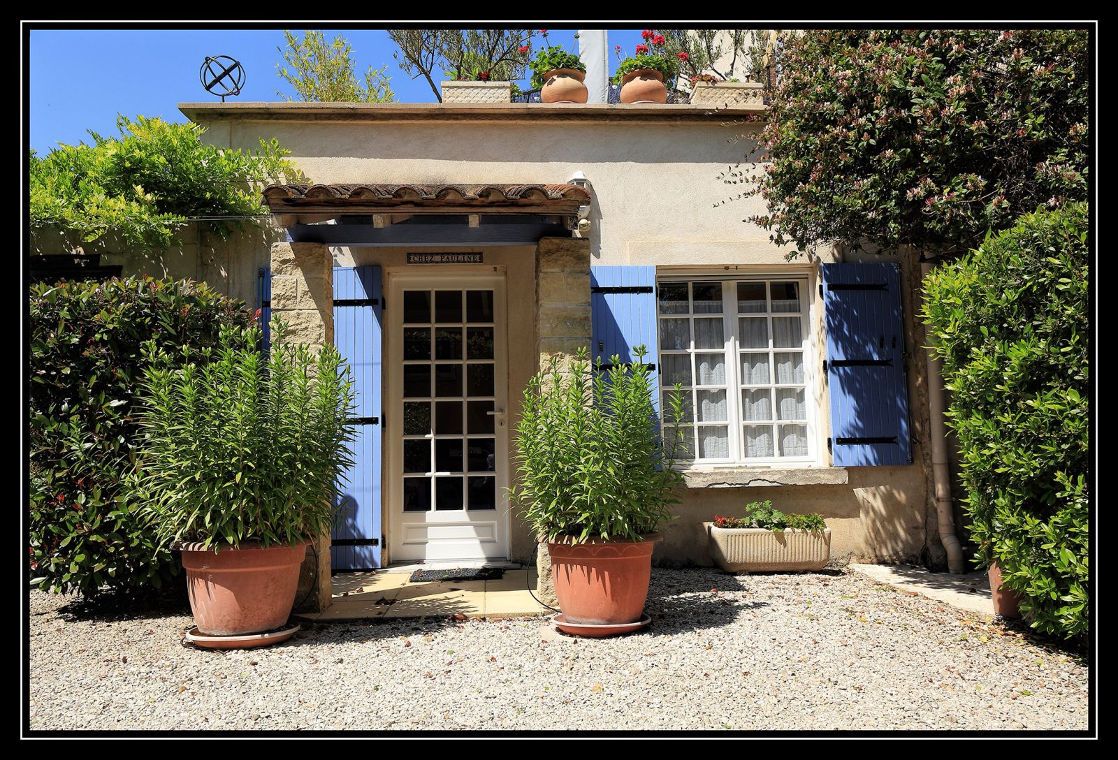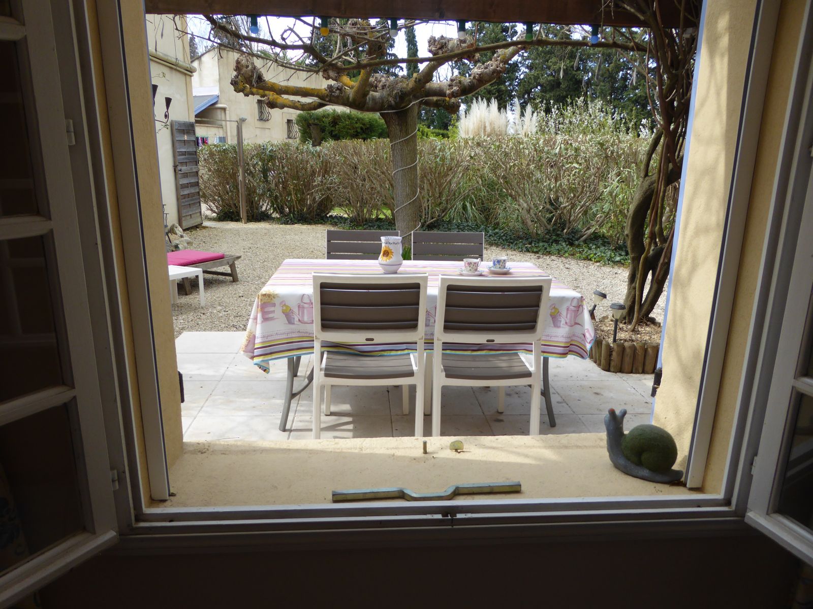 Cuisine donnant sur terrasse ombragée avec glycine, salon de jardin.