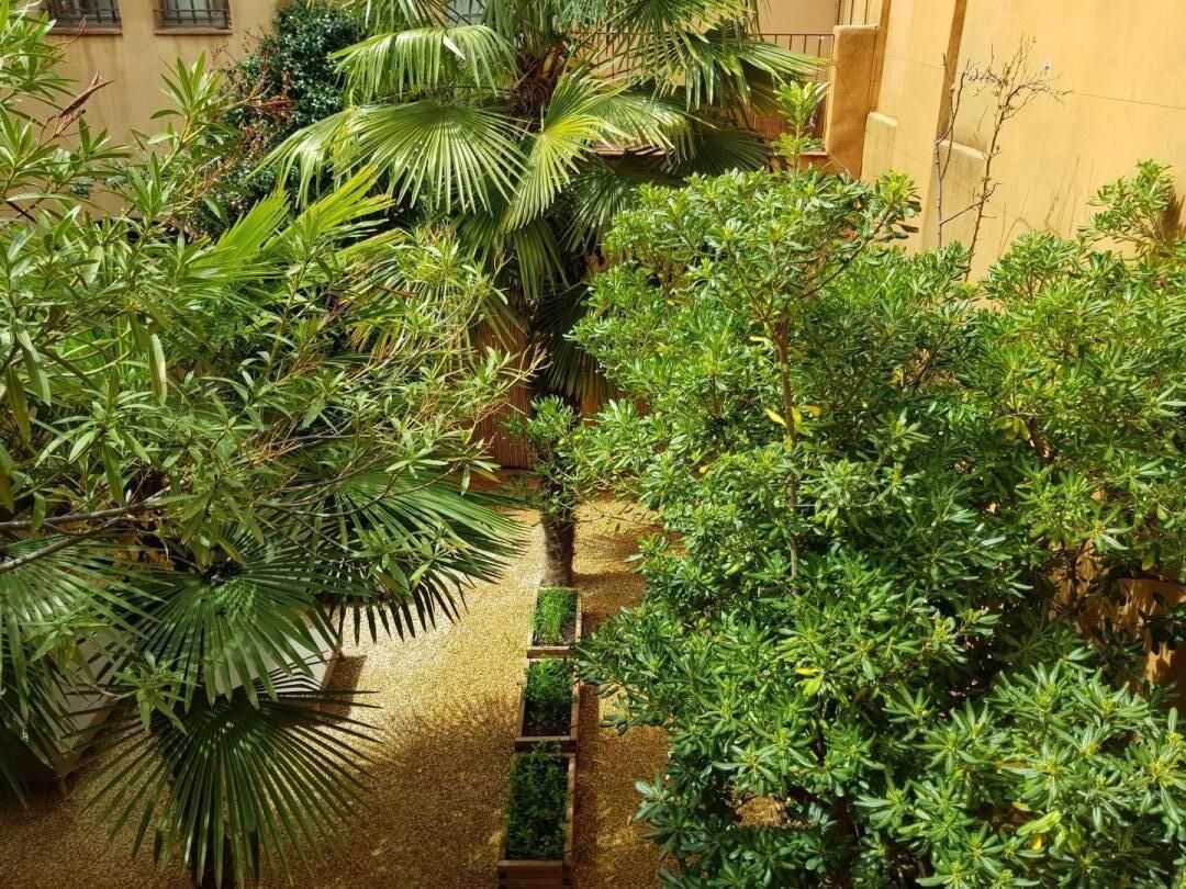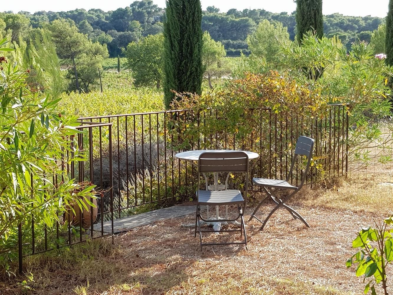 Patio / cour intérieure aménagée avec salon de jardin d'environ 80 m², jardin privatif clos enherbé de 500 m², terrasse d'environ 250 m² et libre accès à la propriété viticole. Barbecue-plancha au gaz.
