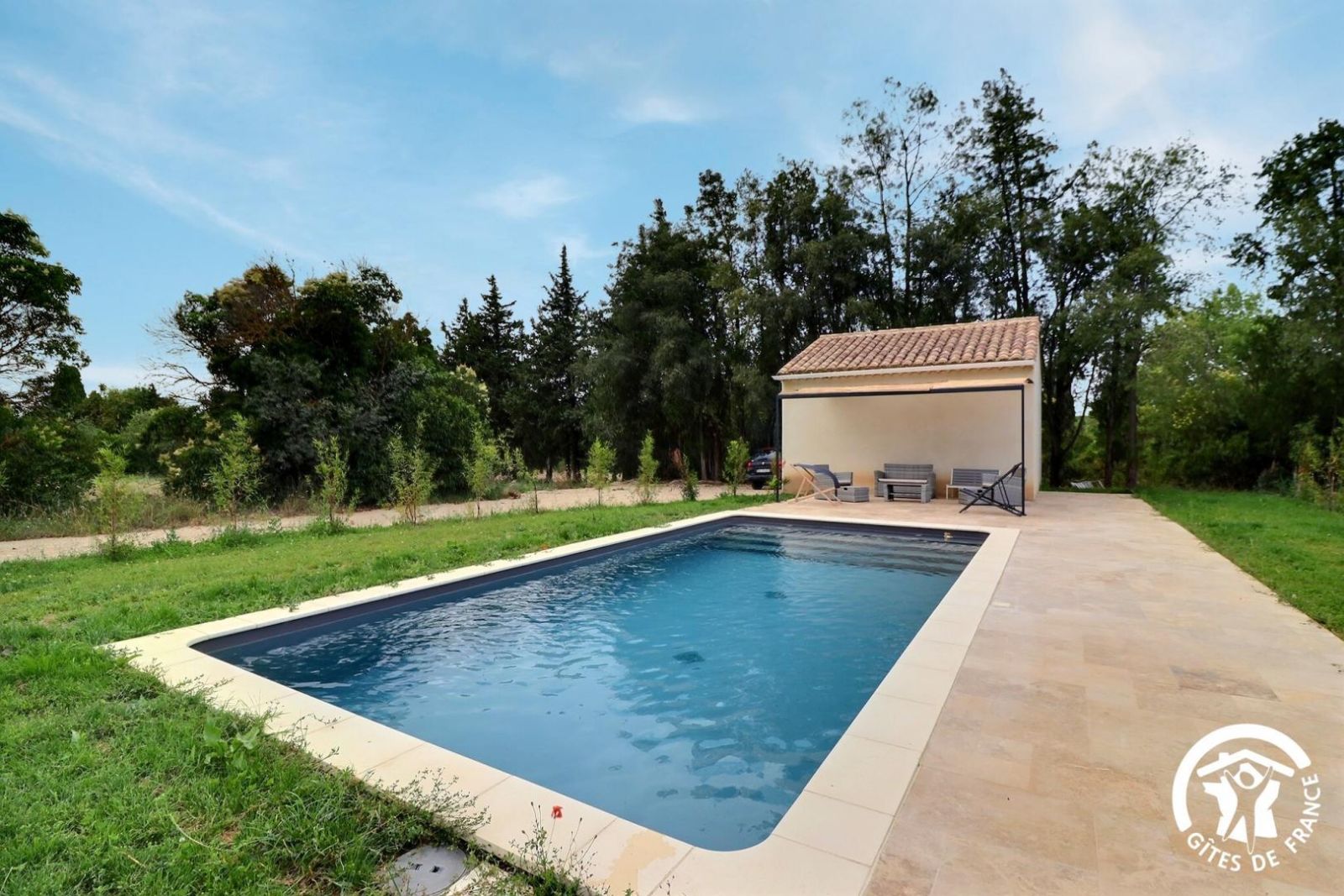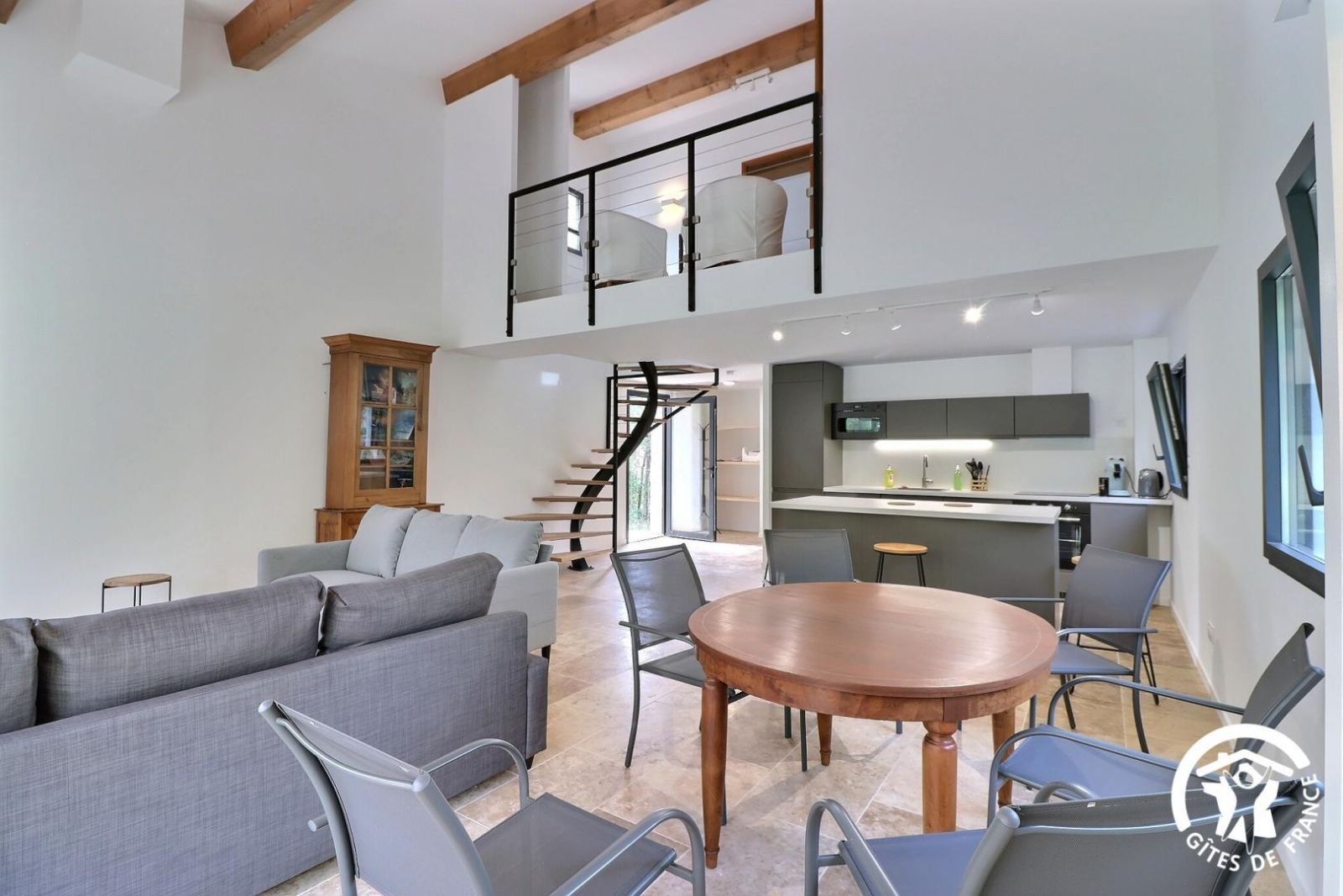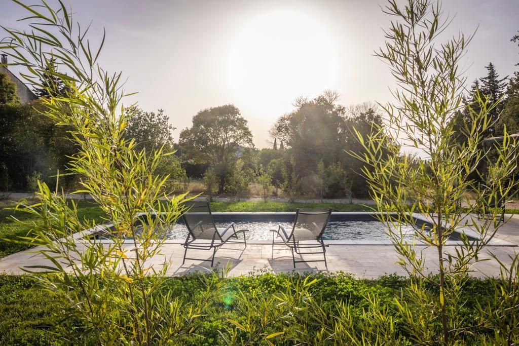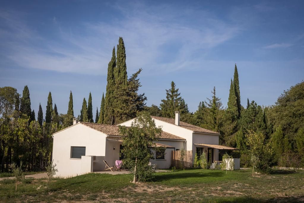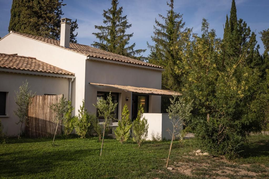 Gîte construit en 2023 avec de beaux matériaux, avec terrasse privative, jardin et piscine communs, situé sur le Parc Naturel Régional des Alpilles, dans un environnement préservé.