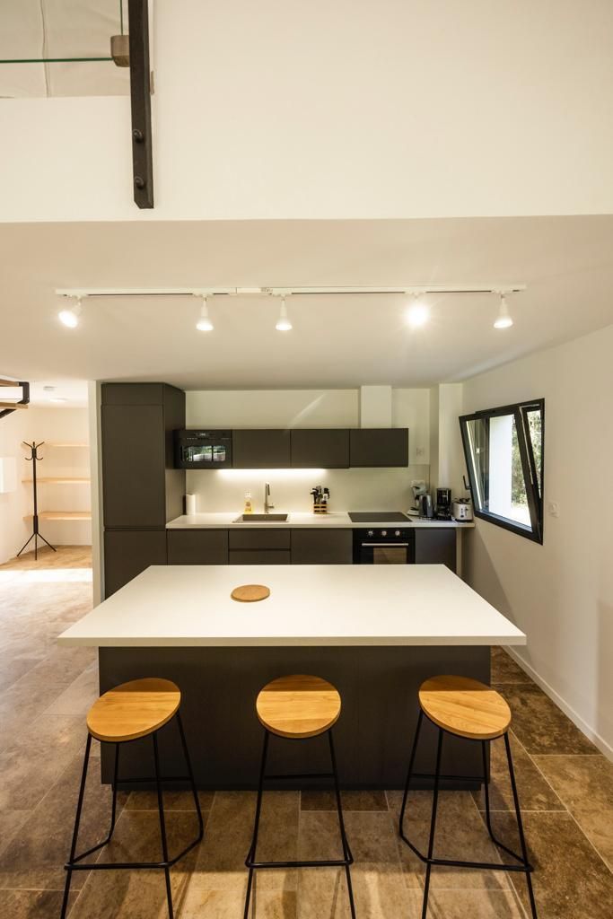 - Séjour avec canapé d'angle et canapé 3 places, fauteuil relax, espace repas pour 8 personnes, home cinéma avec accès TV (chaînes de la box Orange). Cuisine équipée avec plaque 4 feux induction, hotte, micro-ondes, four, lave-vaisselle, réfrigérateur/congélateur, îlot central avec tabourets hauts. Bel escalier hélicoïdal en fer forgé et bois menant à l'étage en mezzanine (belle hauteur sous plafond).