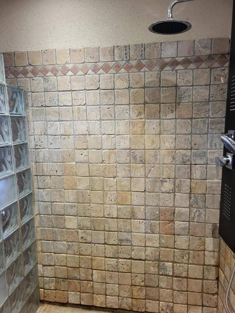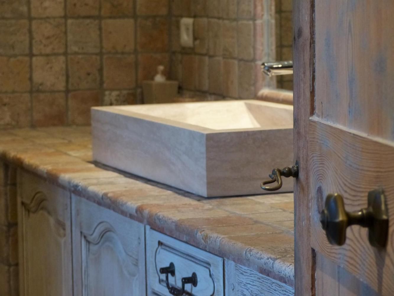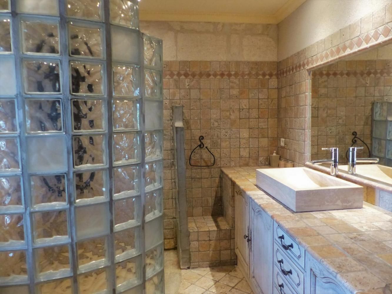 - Salle d'eau avec douche italienne d'angle, vasque en pierre avec grand plan vasque et porte-serviettes chauffant soufflant.