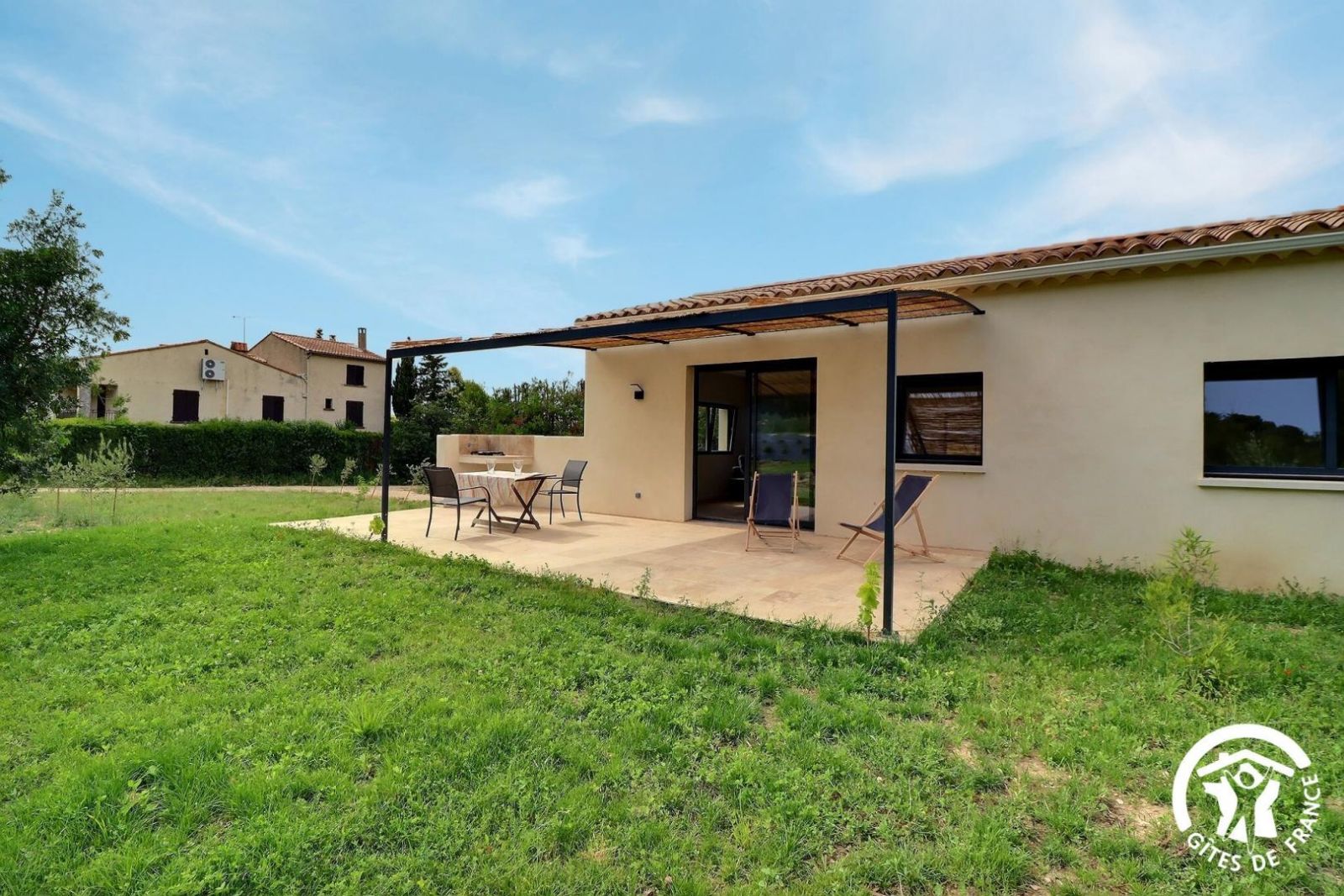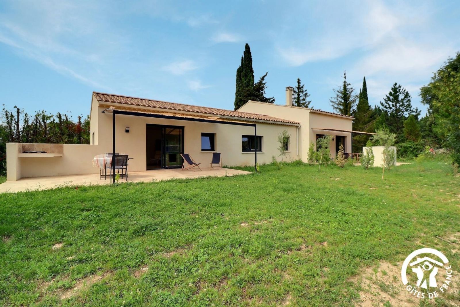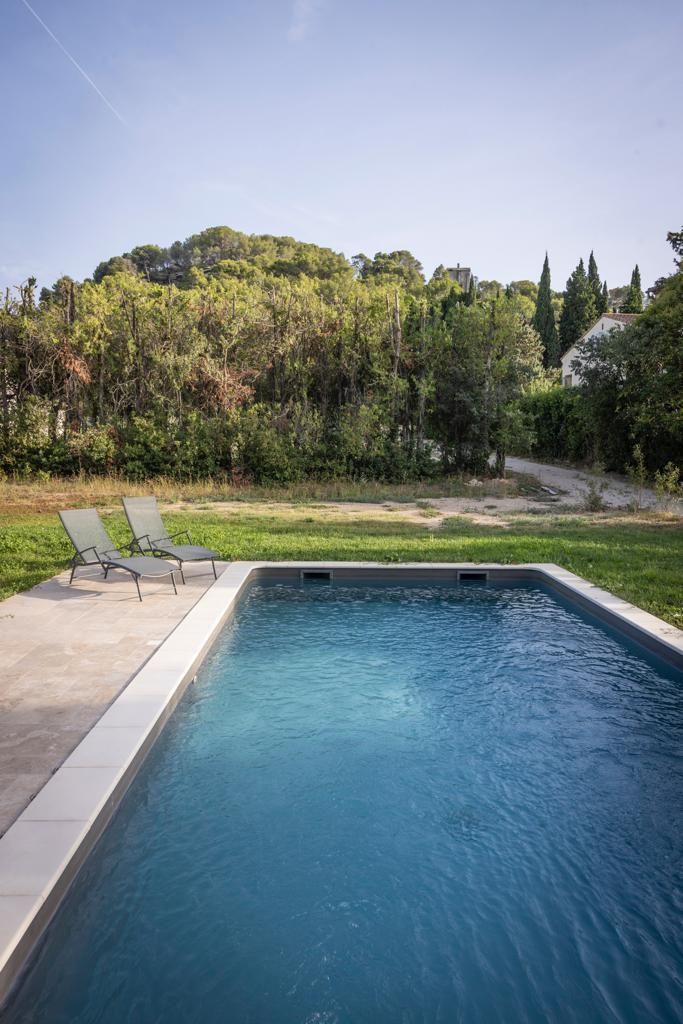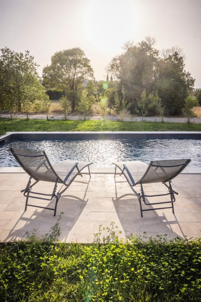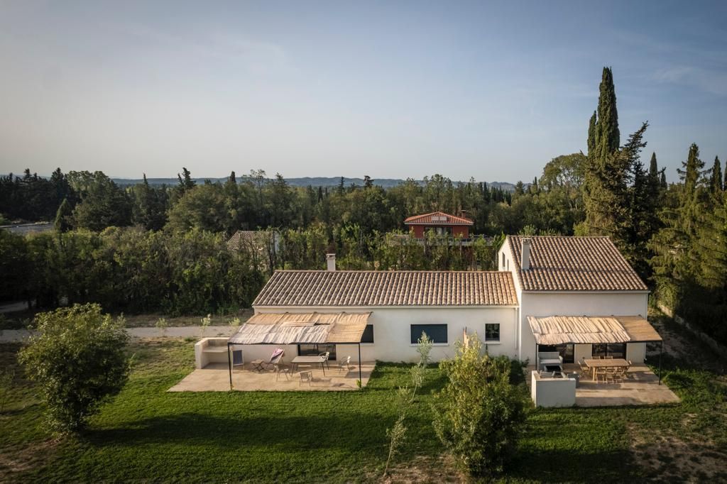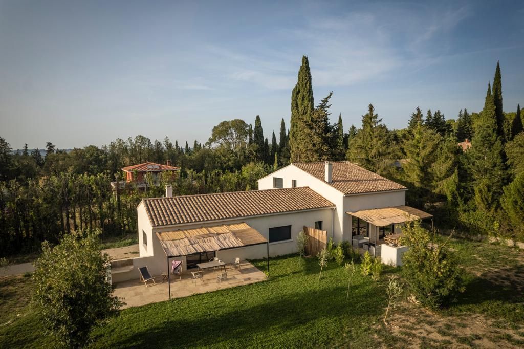 Gîte construit en 2023 avec de beaux matériaux, avec terrasse privative, jardin et piscine communs, situé sur le Parc Naturel Régional des Alpilles, dans un environnement préservé.