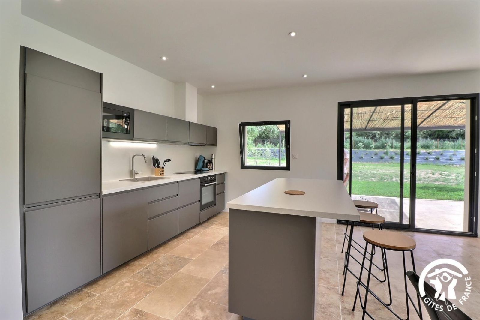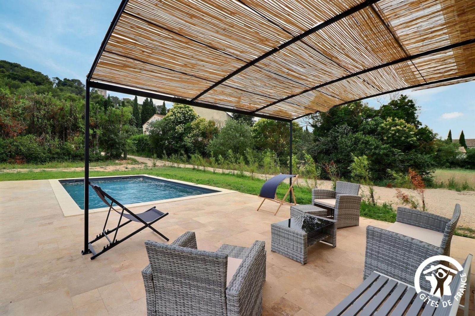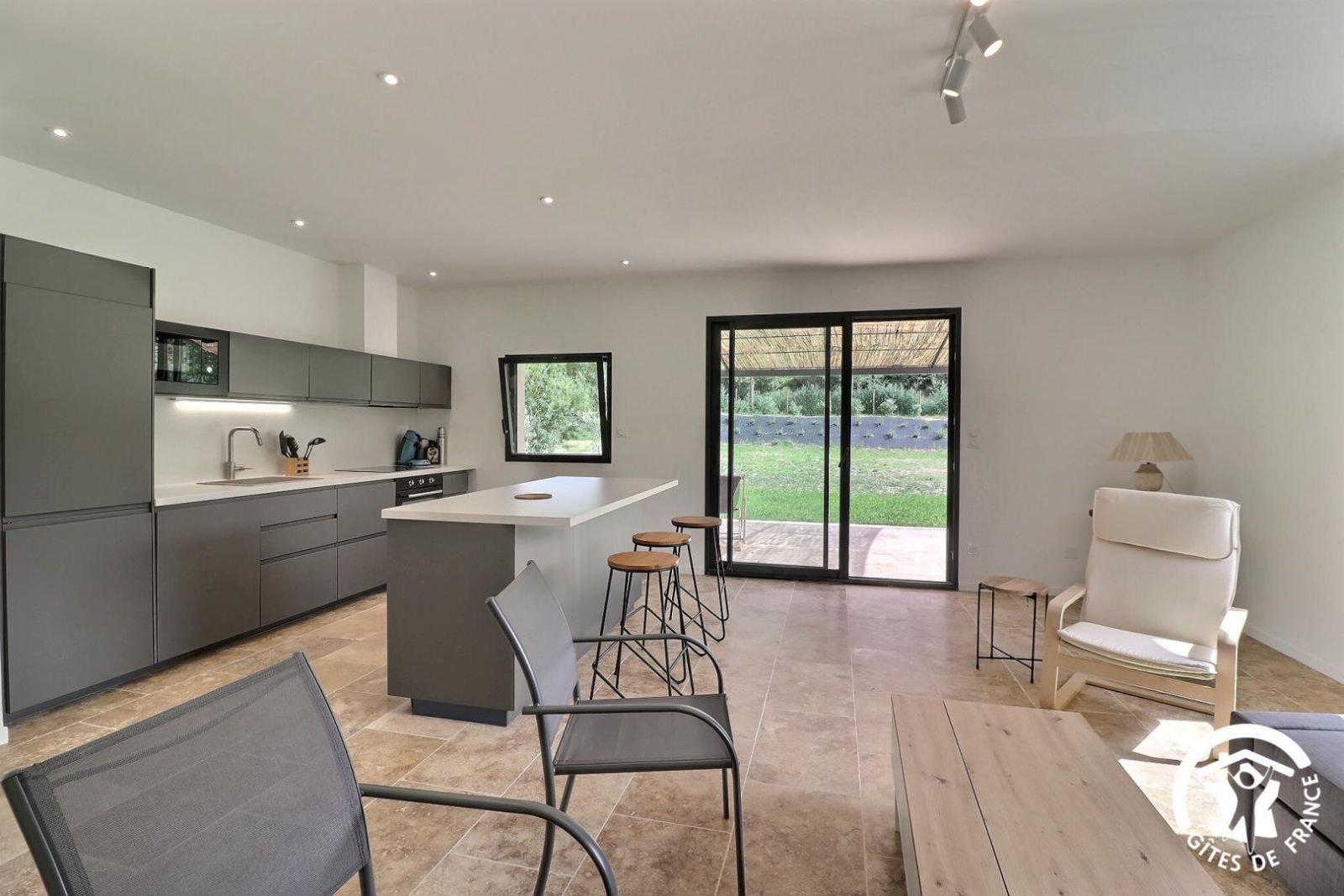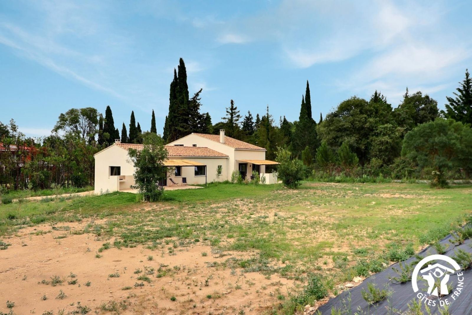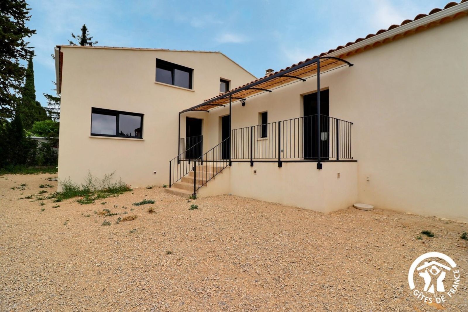 Gîte construit en 2023 avec de beaux matériaux, avec terrasse privative, jardin et piscine communs, situé sur le Parc Naturel Régional des Alpilles, dans un environnement préservé.