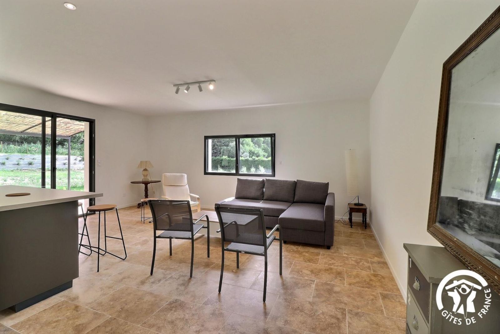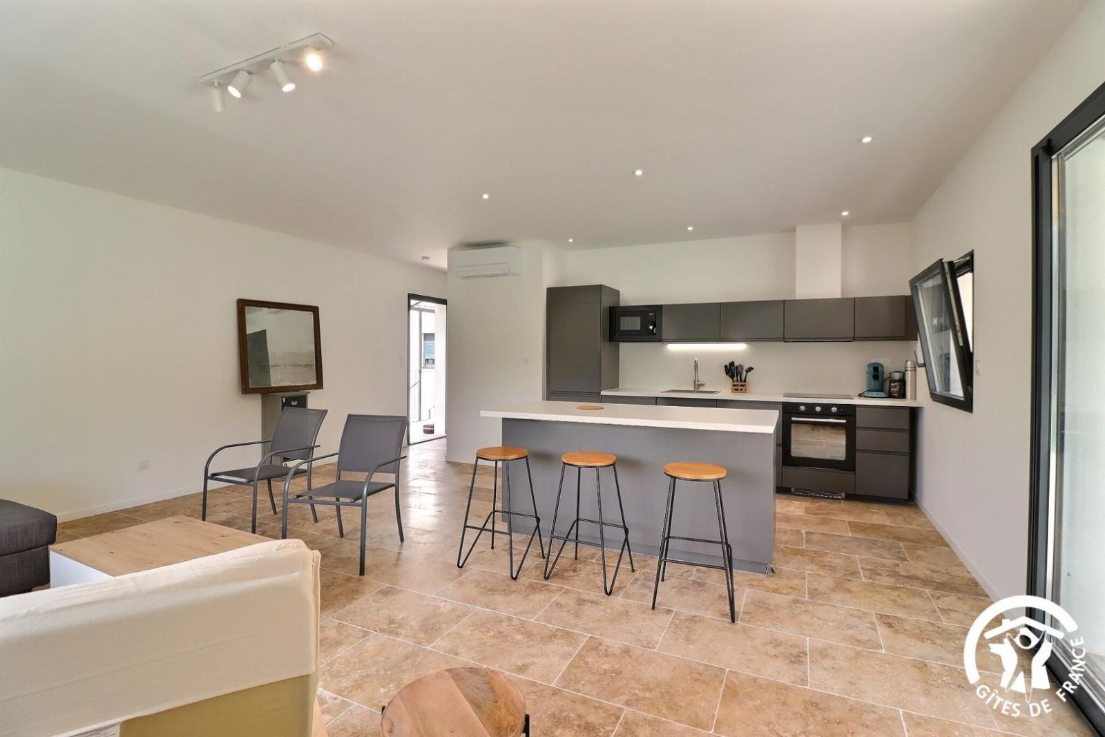 - Séjour avec cuisine équipée (plaque 4 feux induction, hotte, réfrigérateur/congélateur, lave-vaisselle, four et micro-ondes). Îlot central avec bar et tabourets hauts. Salon avec canapé d'angle, fauteuil, et vidéo-projecteur avec accès TV (chaînes de la box Orange). Accès à la terrasse privative depuis le séjour.