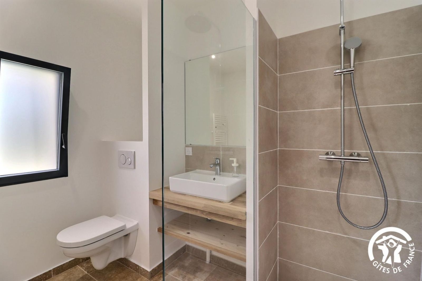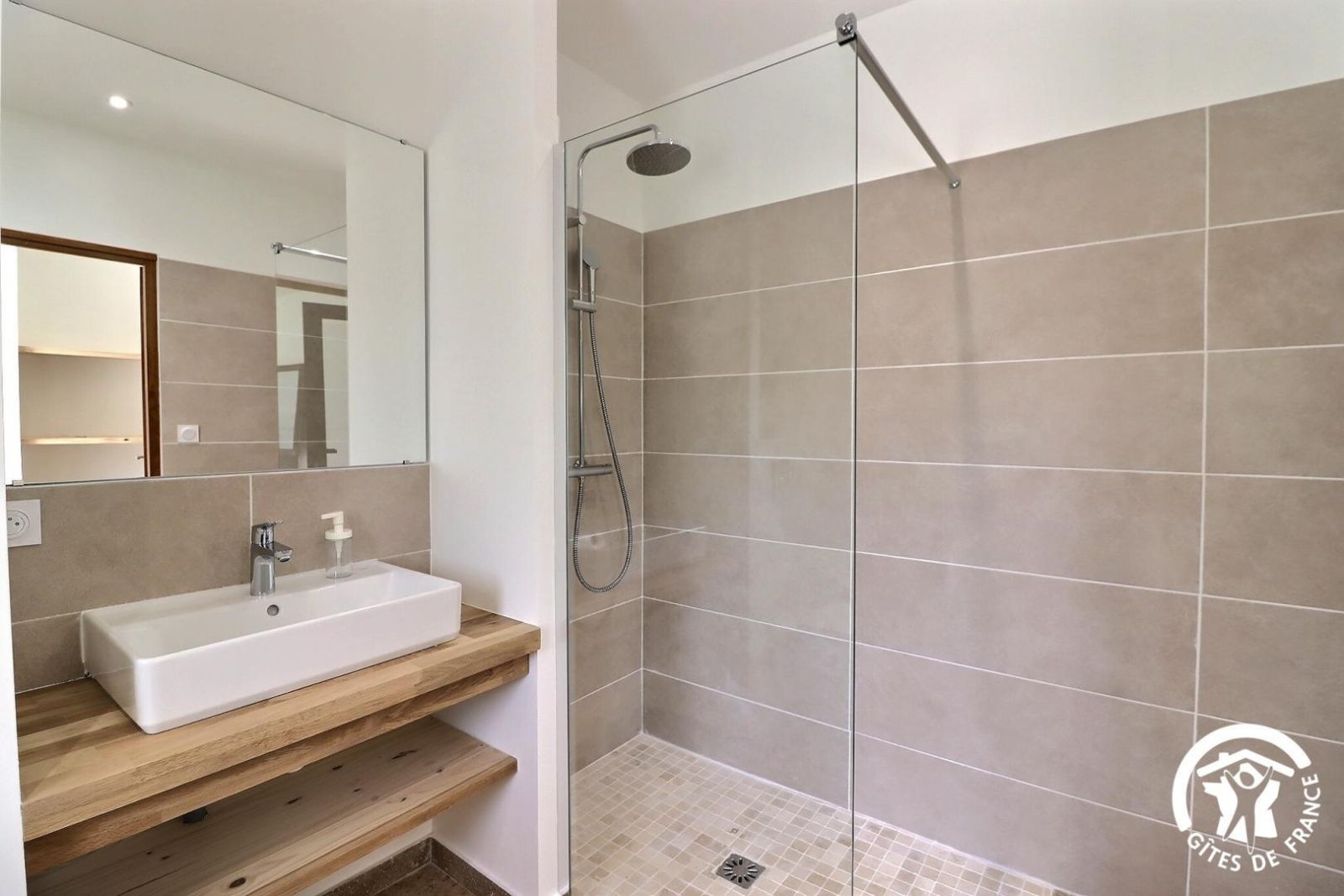 - Salle d'eau avec douche à l'italienne 100x210cm, vasque, porte-serviettes chauffant et WC. Terrasse privative de 40 m² avec salon de jardin et plancha électrique. Grand jardin commun aux 2 gîtes devant les terrasses d'environ 1500 m². Libre accès à la piscine du propriétaire de 4x9m, profondeur 1,5m (fond plat), au sel.