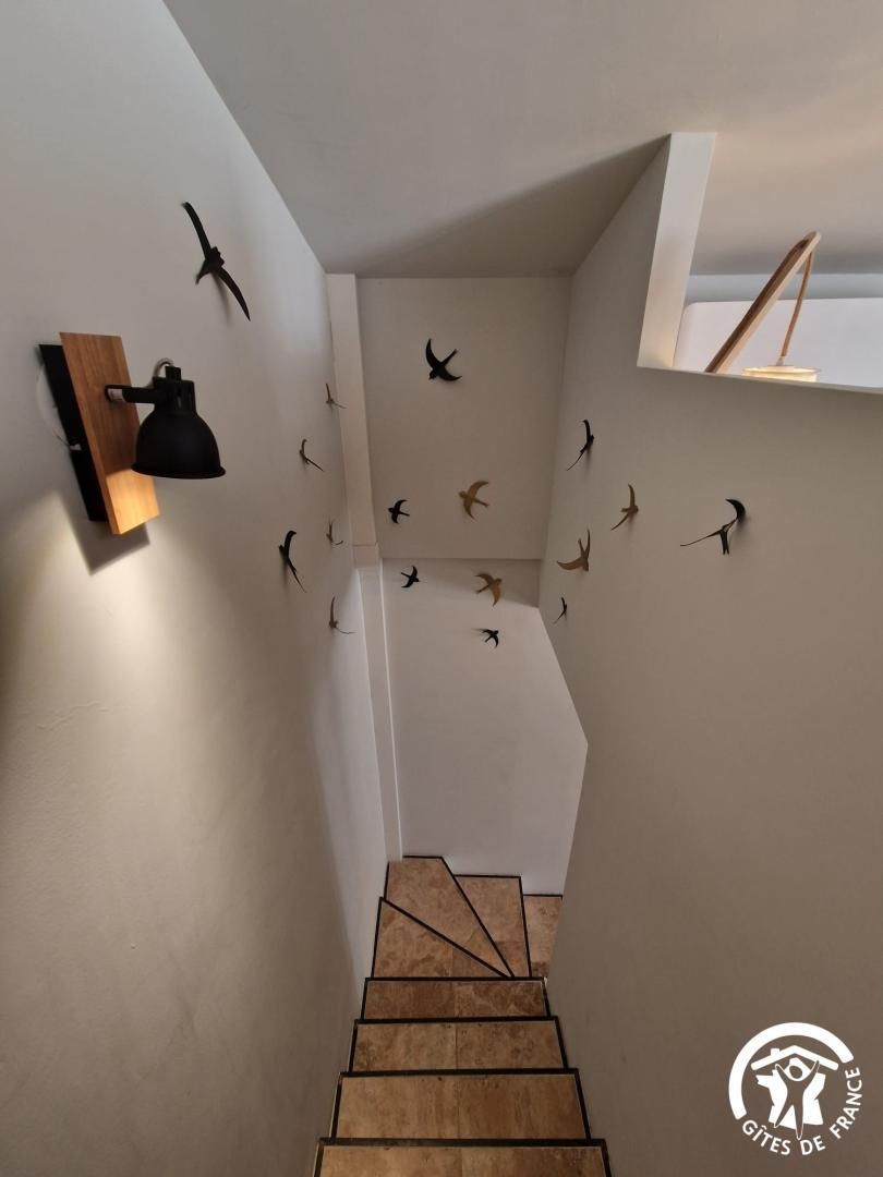 à l'étage se trouve une chambre mansardée ouvrant sur le rooftop avec un lit 140x190, deux chevets et une bibliothèque.