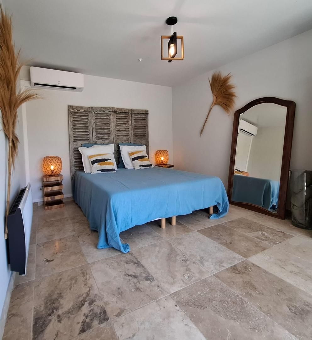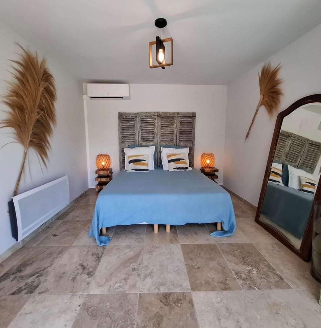- une chambre avec lit 160x200, deux chevets et une armoire avec baie vitrée donnant sur la terrasse.