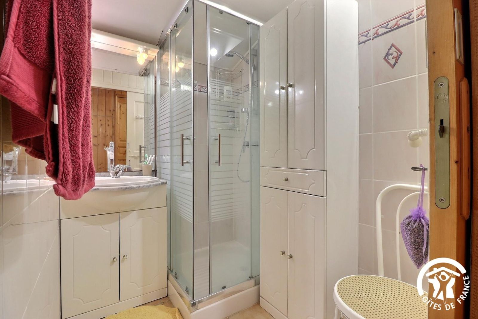 - une salle d'eau avec cabine de douche 80x80cm, lavabo, miroir et meuble de rangement
