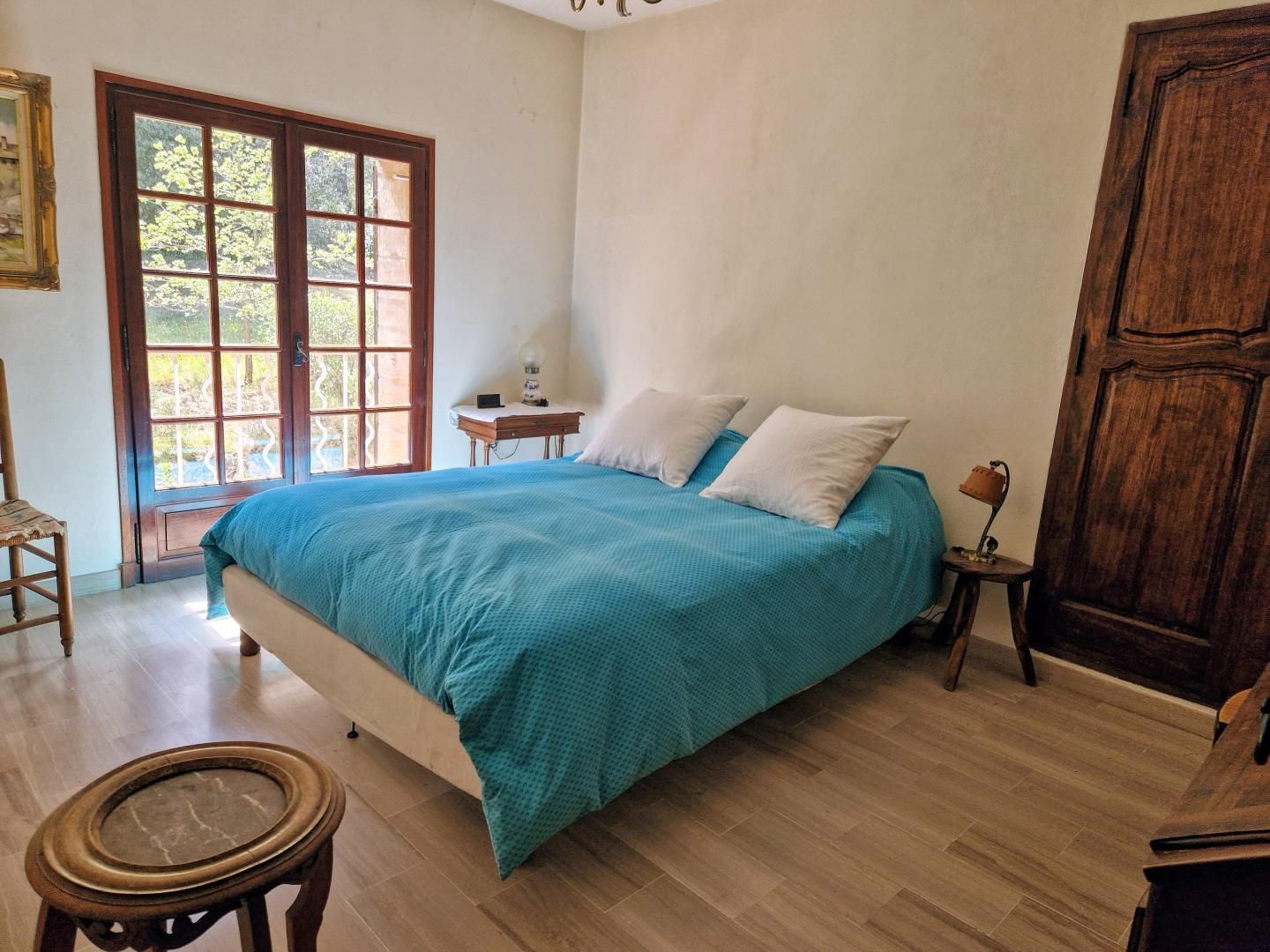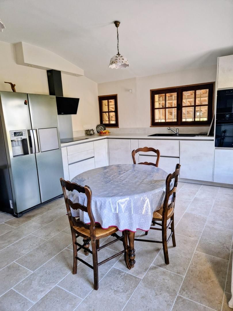 - vaste séjour de 90 m², 4,6m de hauteur sous plafond avec poutres apparentes, avec 2 espaces repas, 4 canapés, 2 fauteuils en cuir avec repose pied, un fauteuil supplémentaire, piano, cheminée avec insert, TV écran plat connectée, lecteur DVD, 2 buffets, vaisselier et commode.