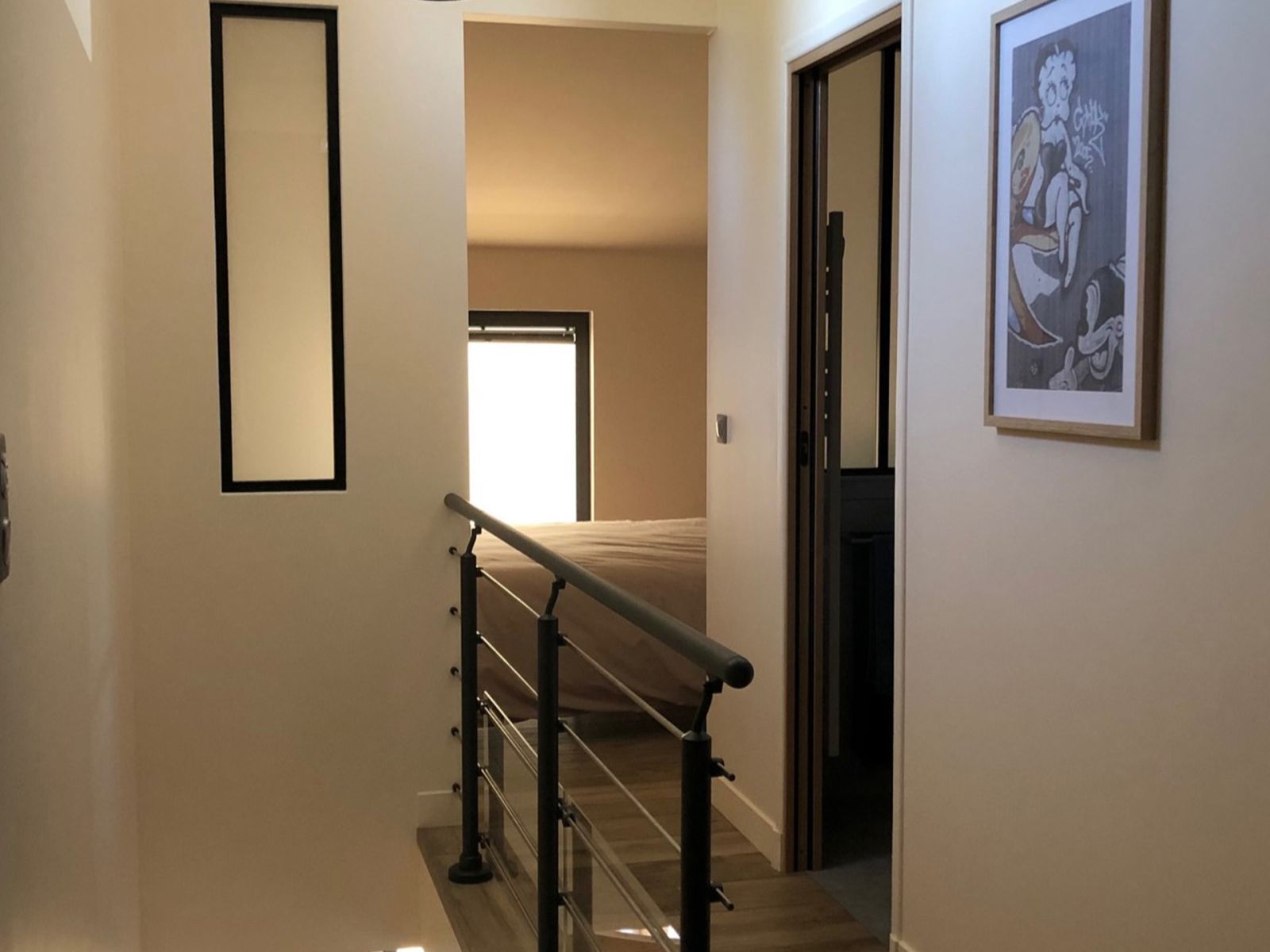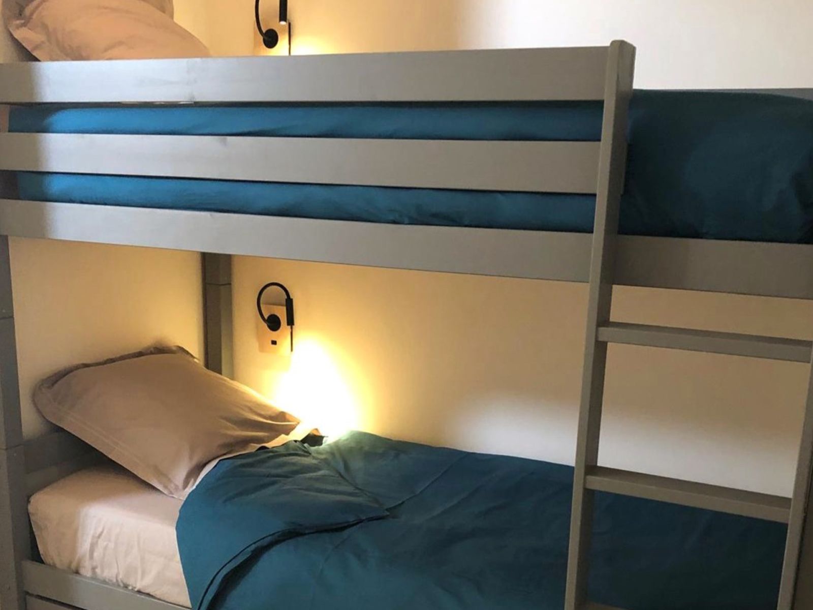 - L'étage accessible par un escalier droit de 14 marches se compose d'une chambre parentale avec un lit queen size (lit 160*200) et TV écran plat, d'une salle de bains double vasque avec grande douche à l'italienne et d'un espace nuit avec 2 lits superposés (90*200). Une grande penderie vous permettra de ranger tous vos effets personnels.