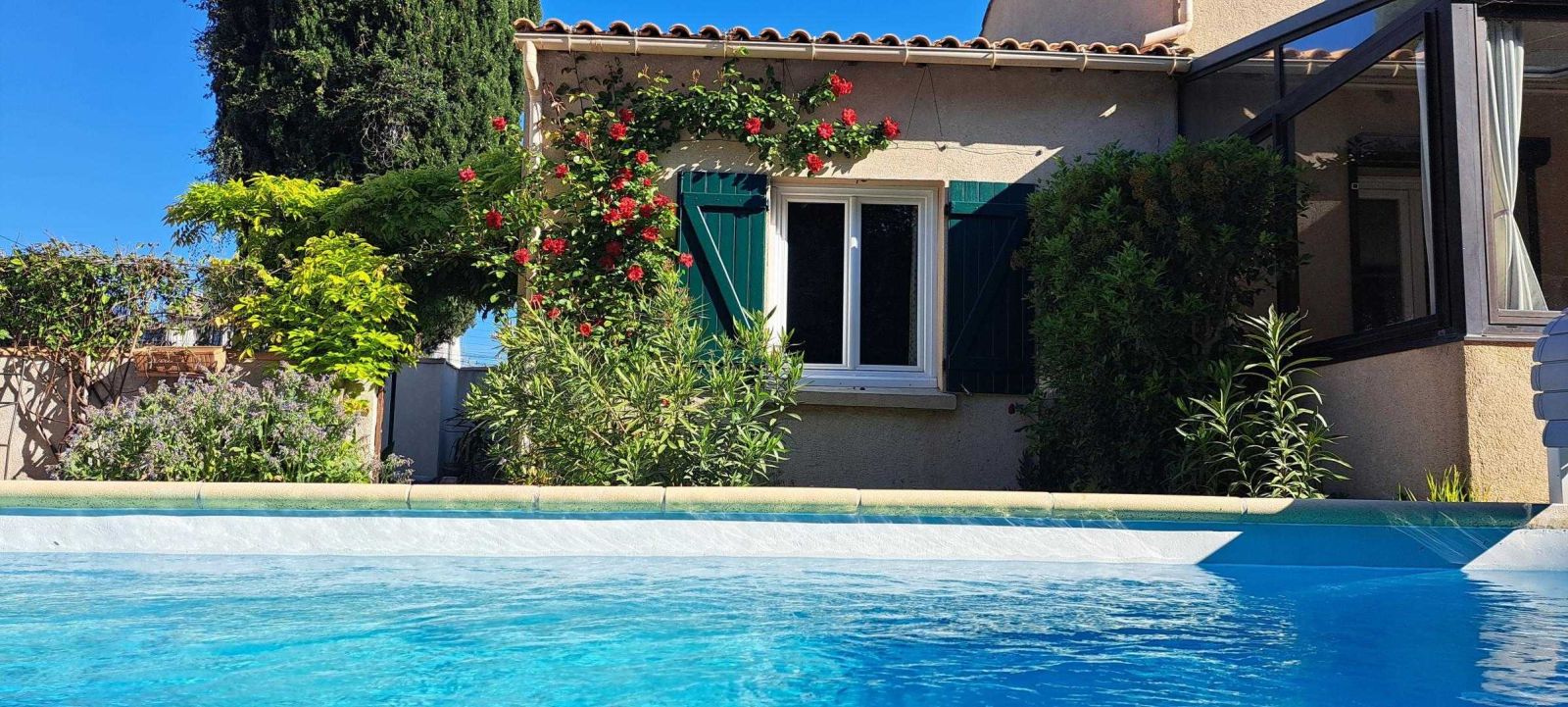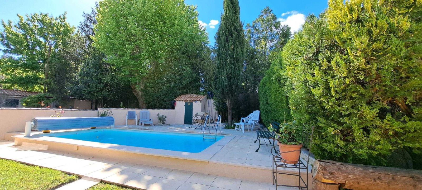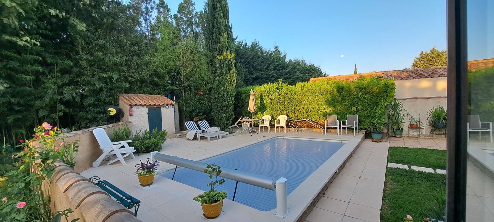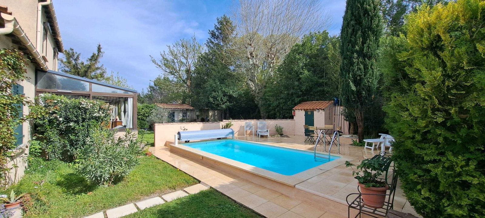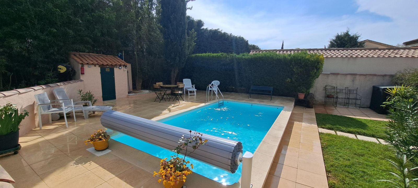 - Piscine sécurisée par volet roulant et clôturée avec des portillons de sécurité.