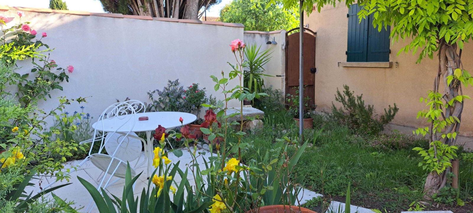 © Gîtes de France Terrasse jardin en fleurs dans la cour de l'Oustau dei Aucèus.