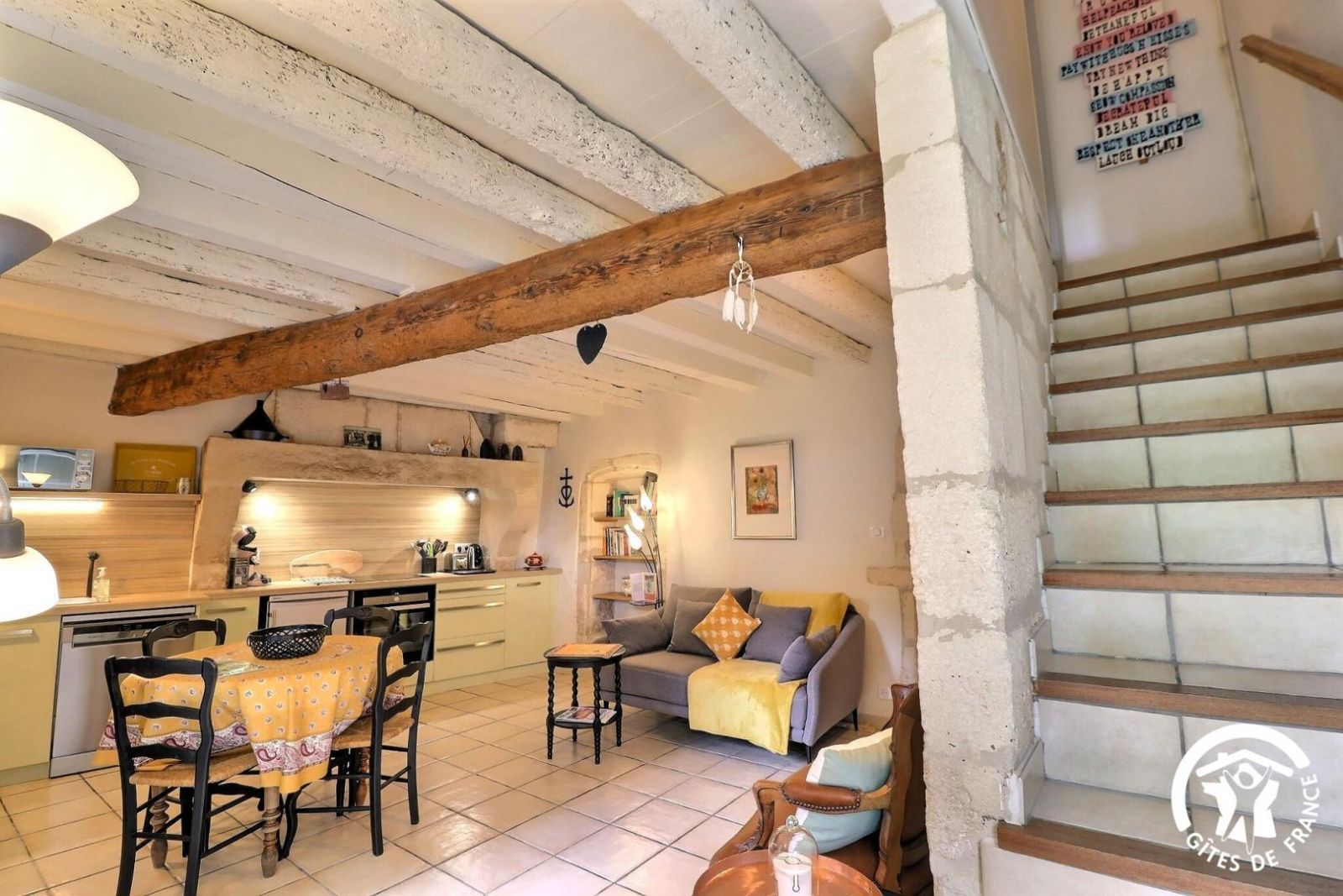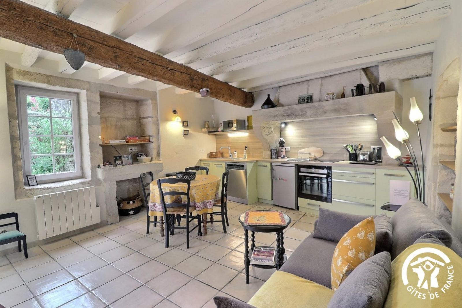 - Séjour avec cuisine équipée aménagée dans une ancienne cheminée en pierre (beaucoup de cachet) avec plaque 4 feux vitrocéramique, petit réfrigérateur top, lave-vaisselle et micro-ondes. Espace repas pour 3 personnes, 2 canapés. Bel escalier en pierre menant à la chambre.