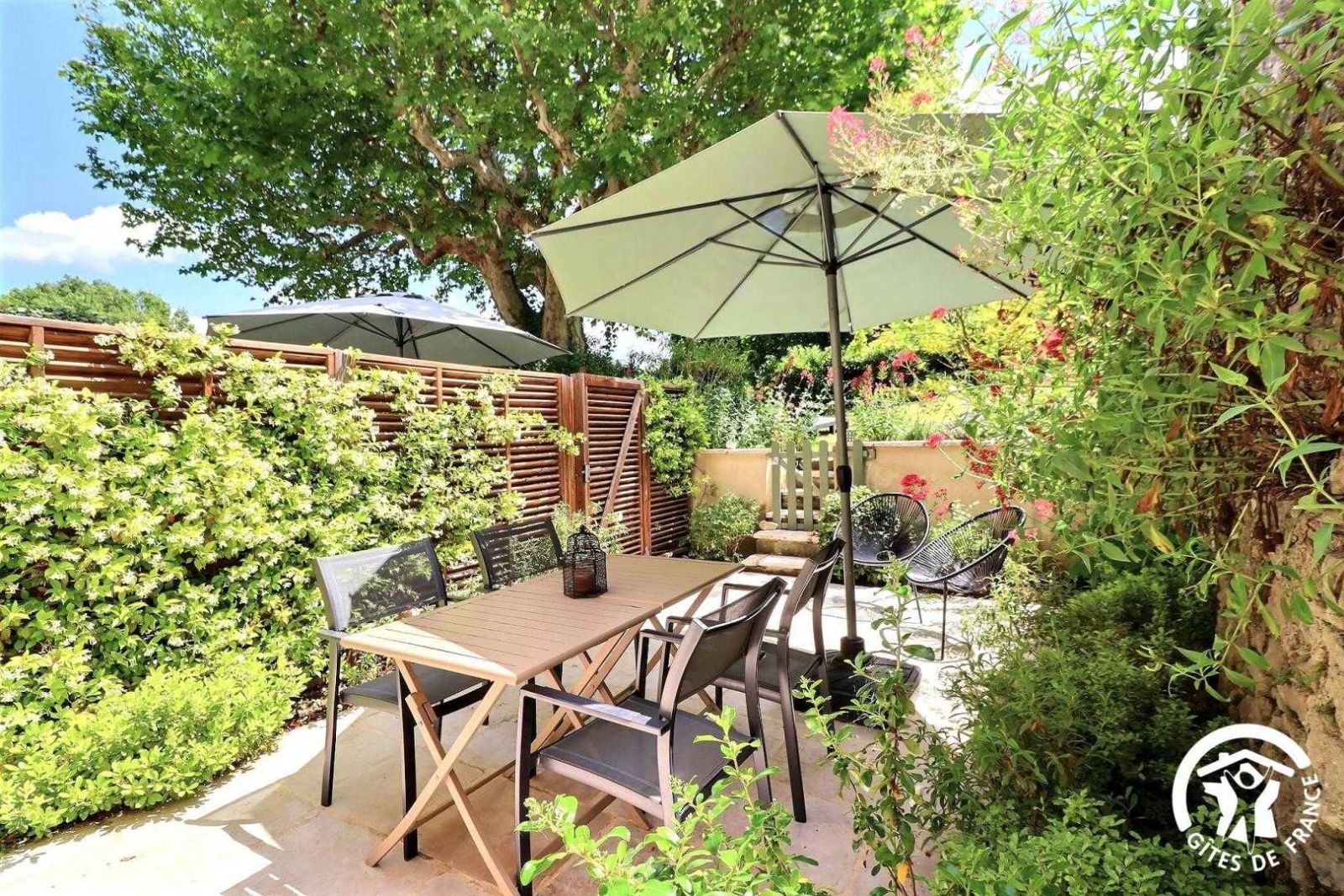 Terrasse privative de 30 m² avec salon de jardin et jardin commun aux 2 gîtes de 100 m² environ avec bains de soleil.