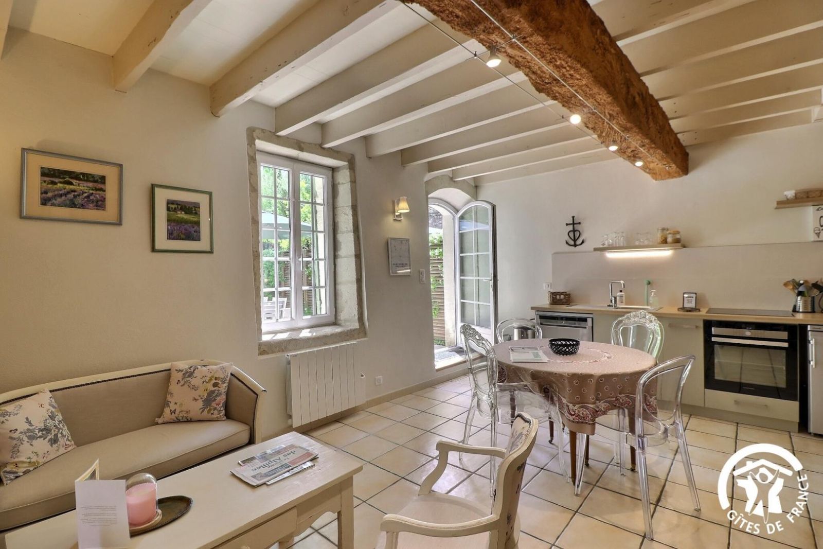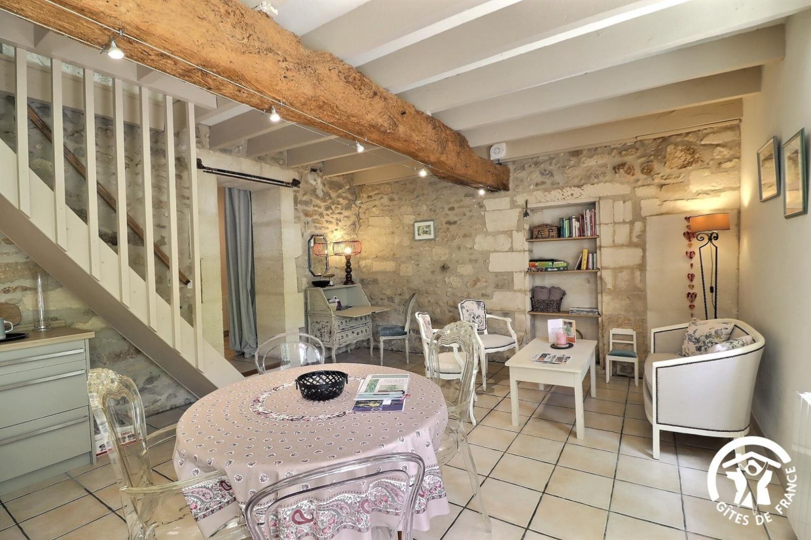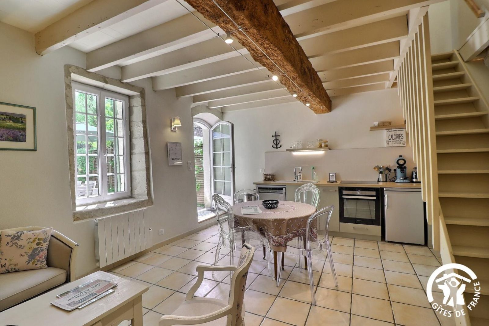 - Un séjour avec poutres apparentes comprenant une cuisine équipée avec plaque 4 feux vitrocéramique, four, lave-vaisselle, petit réfrigérateur top, micro-ondes et cafetière à dosettes Senseo. Espace repas pour 4 personnes. Coin salon avec banquette 2 personnes, fauteuils et table basse. Bibliothèque, jeux de société. Coin bureau. Accès à la chambre par l'escalier.