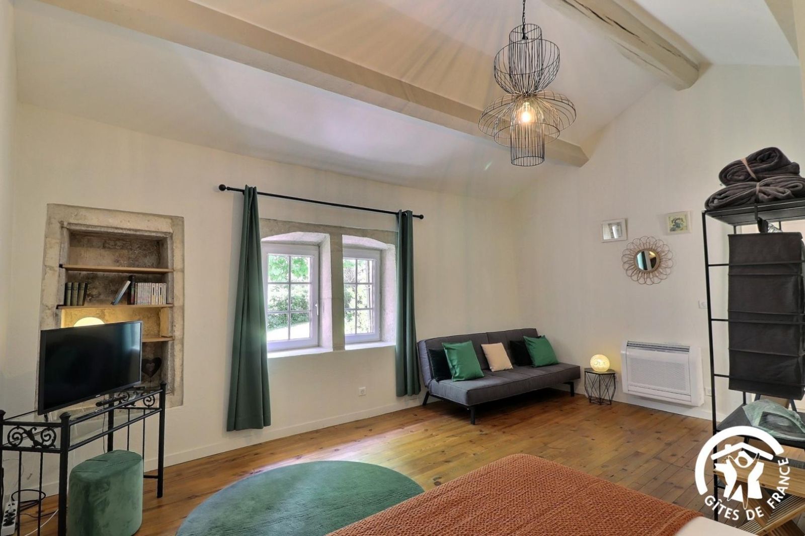 - WC indépendant. A l'étage, la grande chambre est équipée d'un lit 2 personnes 160x200cm, d'un canapé convertible pouvant accueillir 1 couchage, TV écran plat, bibliothèque, portant à vêtements et miroir en pied. Vue sur le jardin et la terrasse. Climatisation réversible. Terrasse privative de 42 m² avec salon de jardin et jardin commun aux 2 gîtes de 100 m² environ avec bains de soleil. Tout inclus : chauffage électrique, climatisation réversible, ménage de fin de séjour, draps et linge de toilette. Parking privatif fermé à proximité immédiate du gîte avec borne de recharge pour véhicules électriques (inclus).