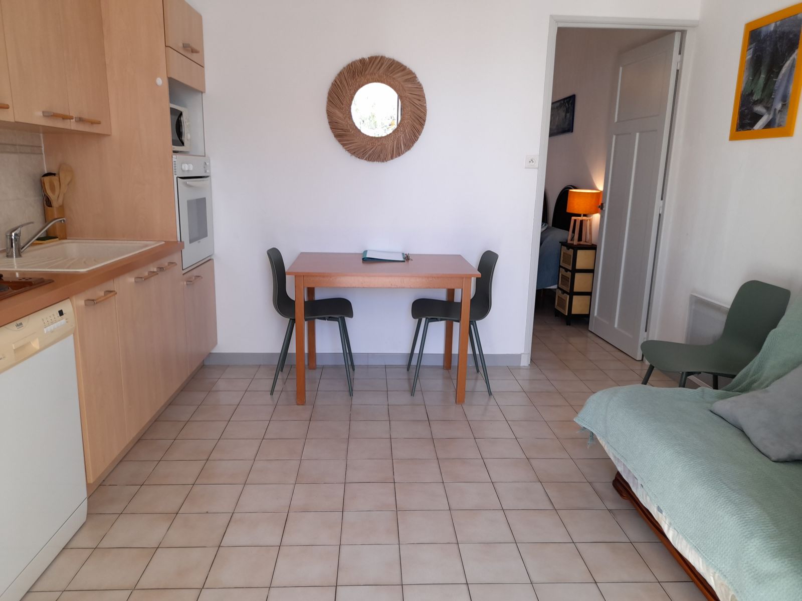 Un plus pour cet appartement : le coin salon peut être séparé de la cuisine par une cloison coulissante et ainsi constituer une "seconde chambre" le soir.
