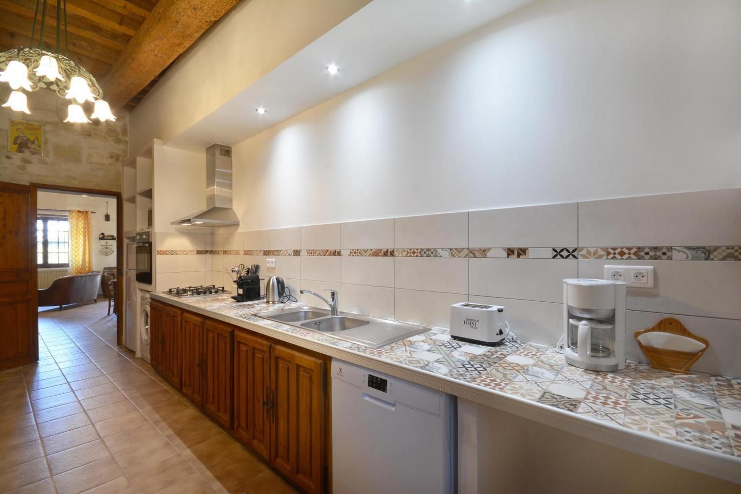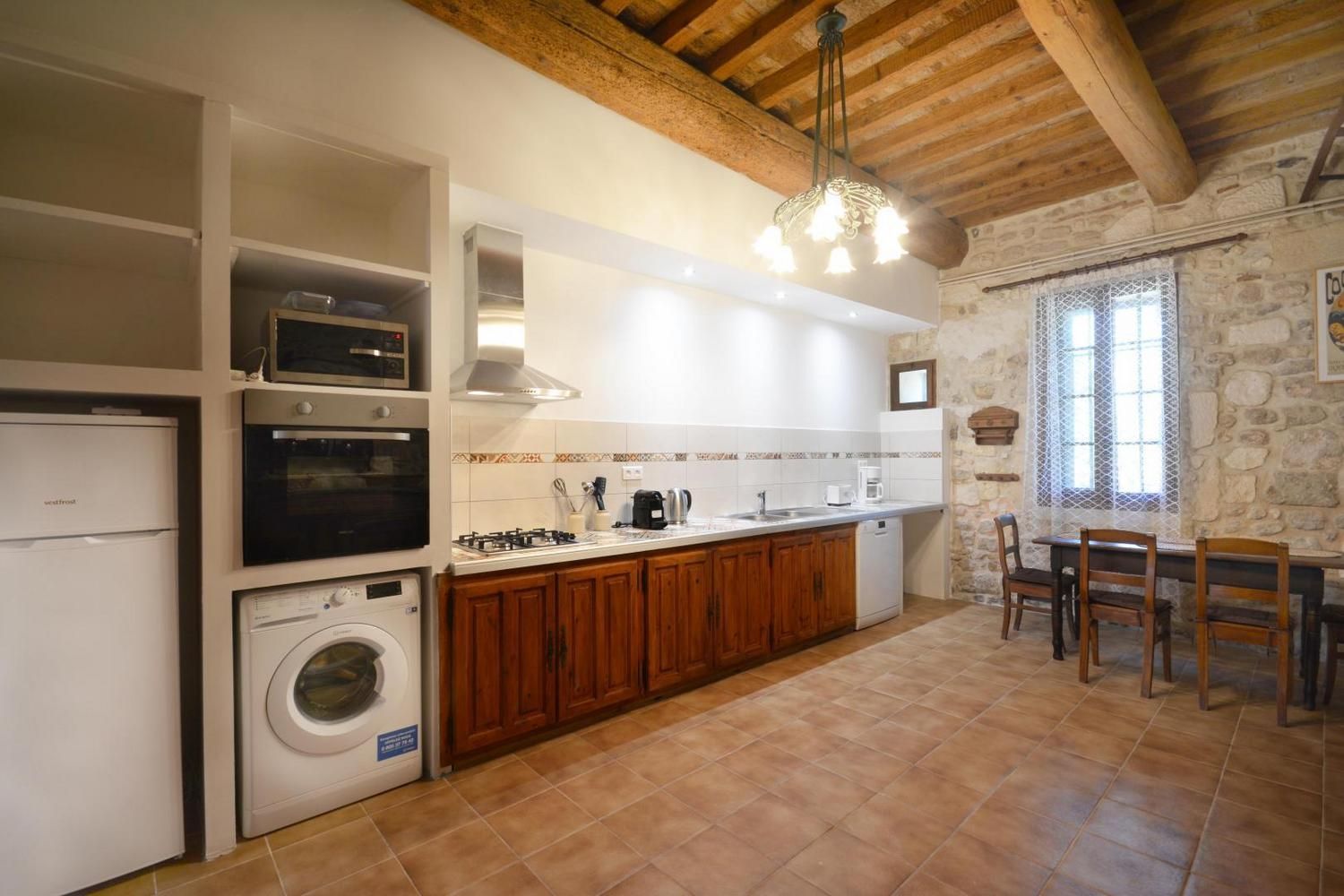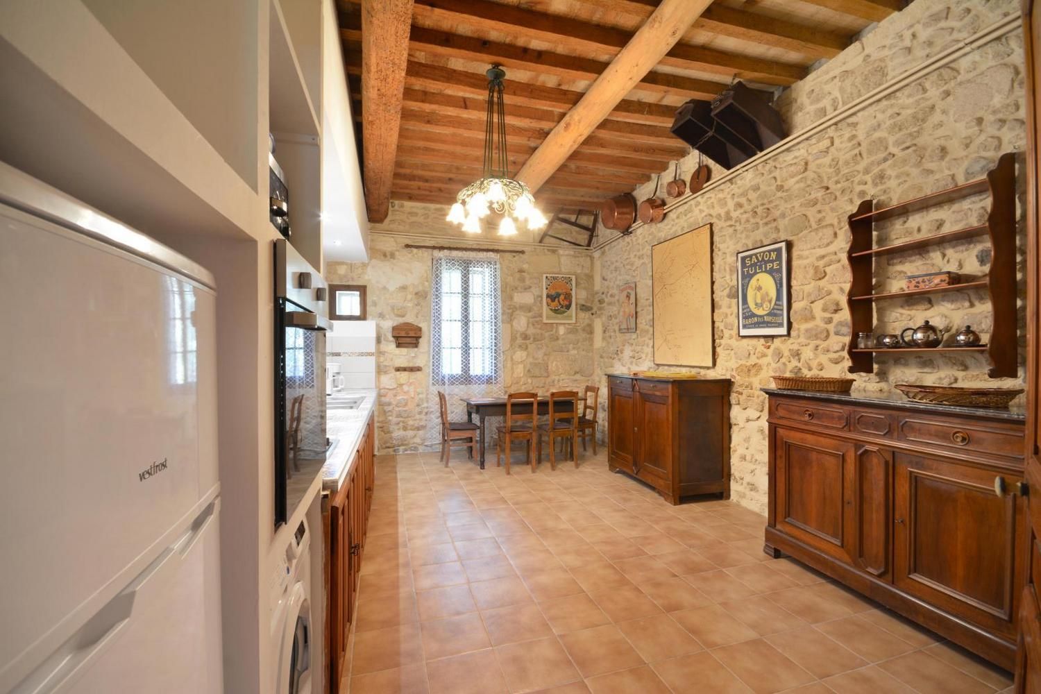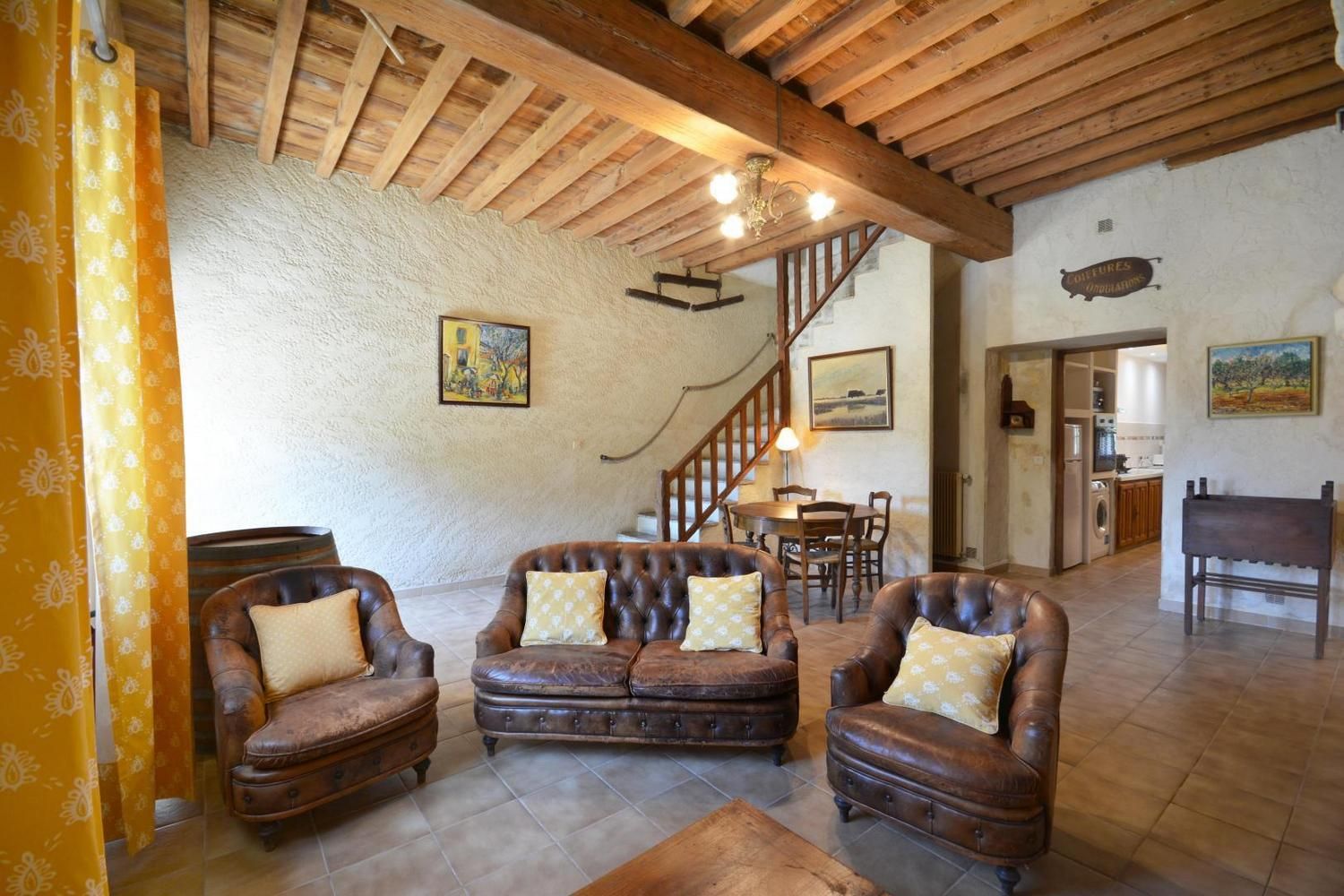 Rez de Chaussée : séjour avec grande cheminée camarguaise, fauteuils et TV écran plat. Cuisine (réfrigérateur/congélateur, plaque 4 feux gaz, lave-linge, lave-vaisselle, micro-ondes, machine Nespresso à capsules, four et hotte aspirante).
