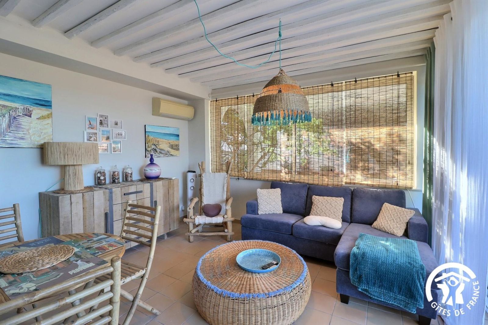 - Salon lumineux et climatisé avec canapé d'angle, fauteuil, table basse, TV connectée, vaisselier, tables et chaises.