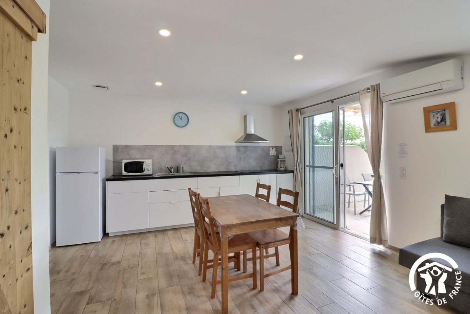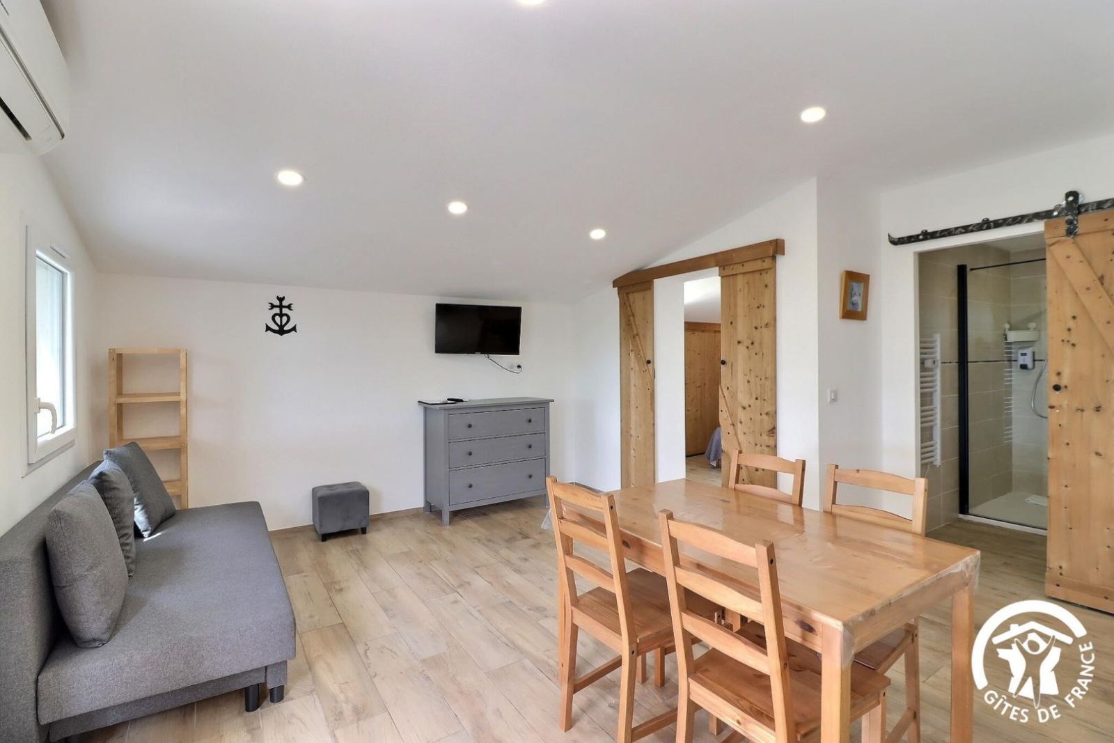 - un séjour avec cuisine équipée, un canapé convertible, une TV et une table avec 4 chaises