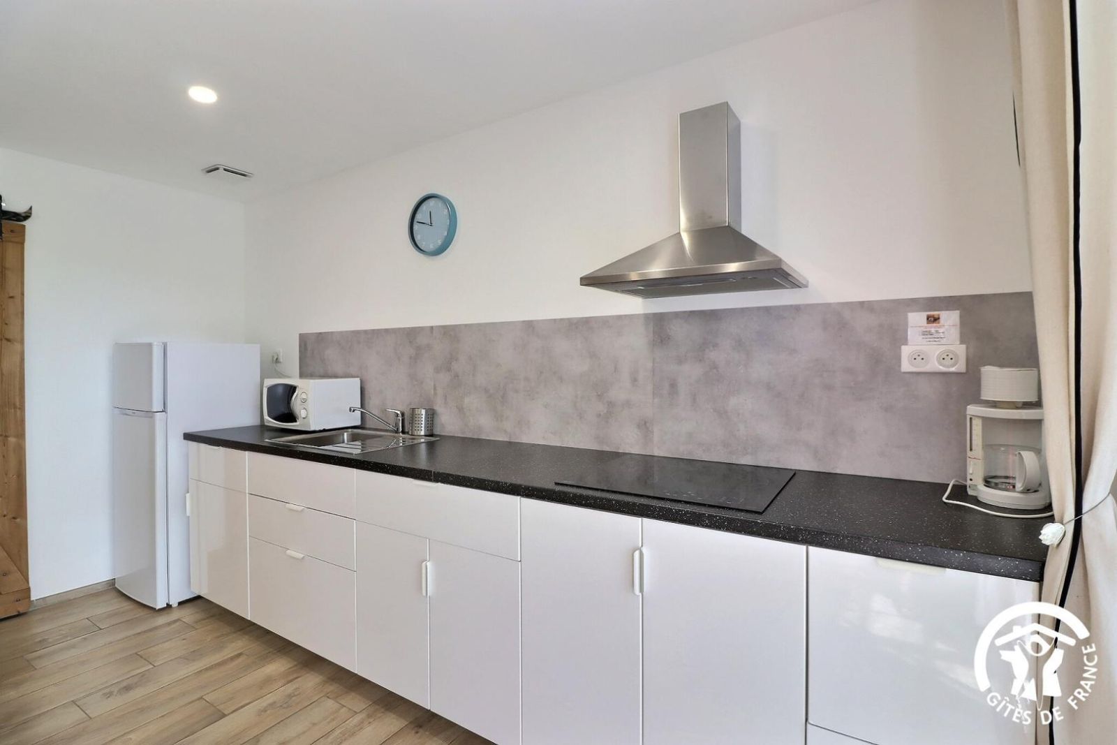 Profitez de votre terrasse privative avec salon de jardin et transats. Le gîte, de plain-pied climatisé est composé de :