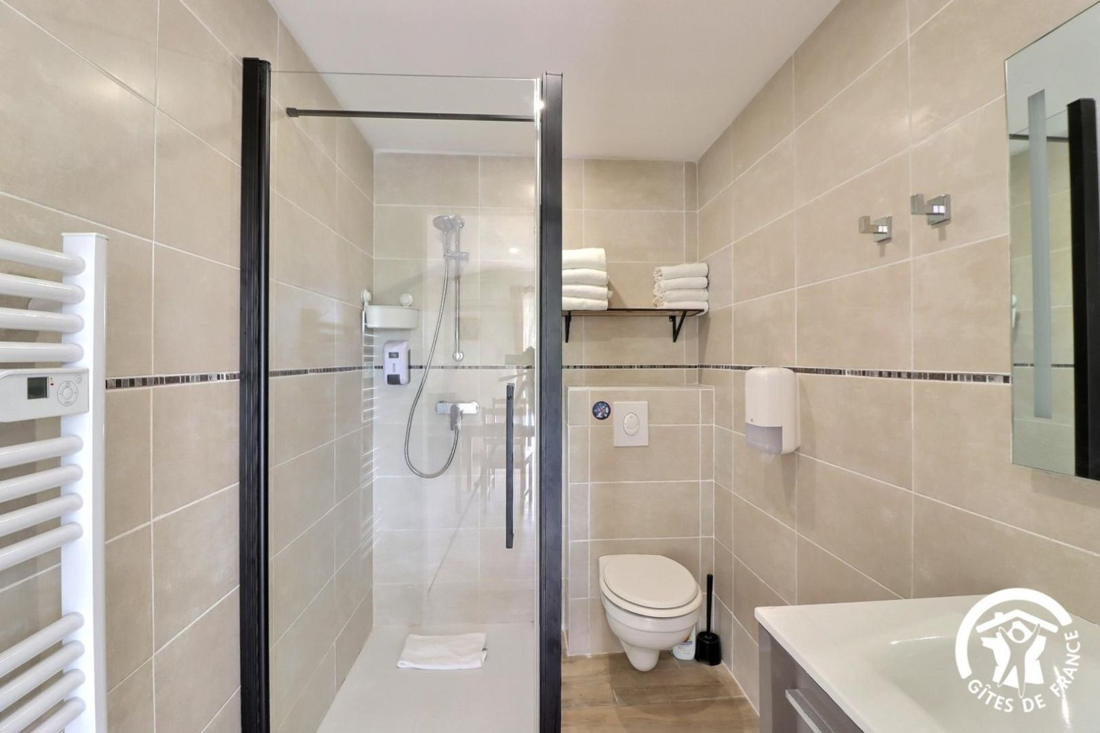- une salle d'eau avec une grande douche, un meuble vasque, un sèche-serviette chauffant et un WC