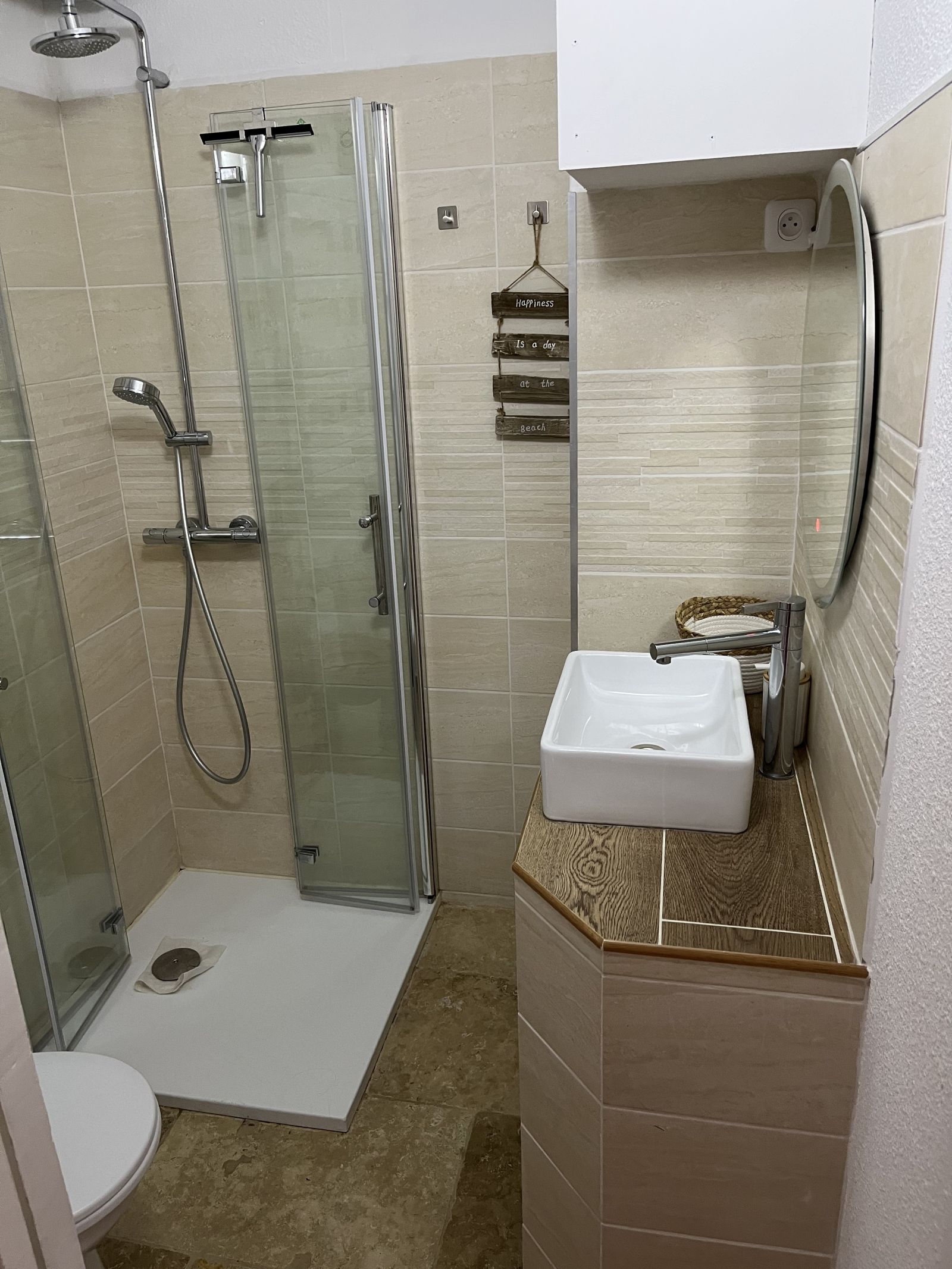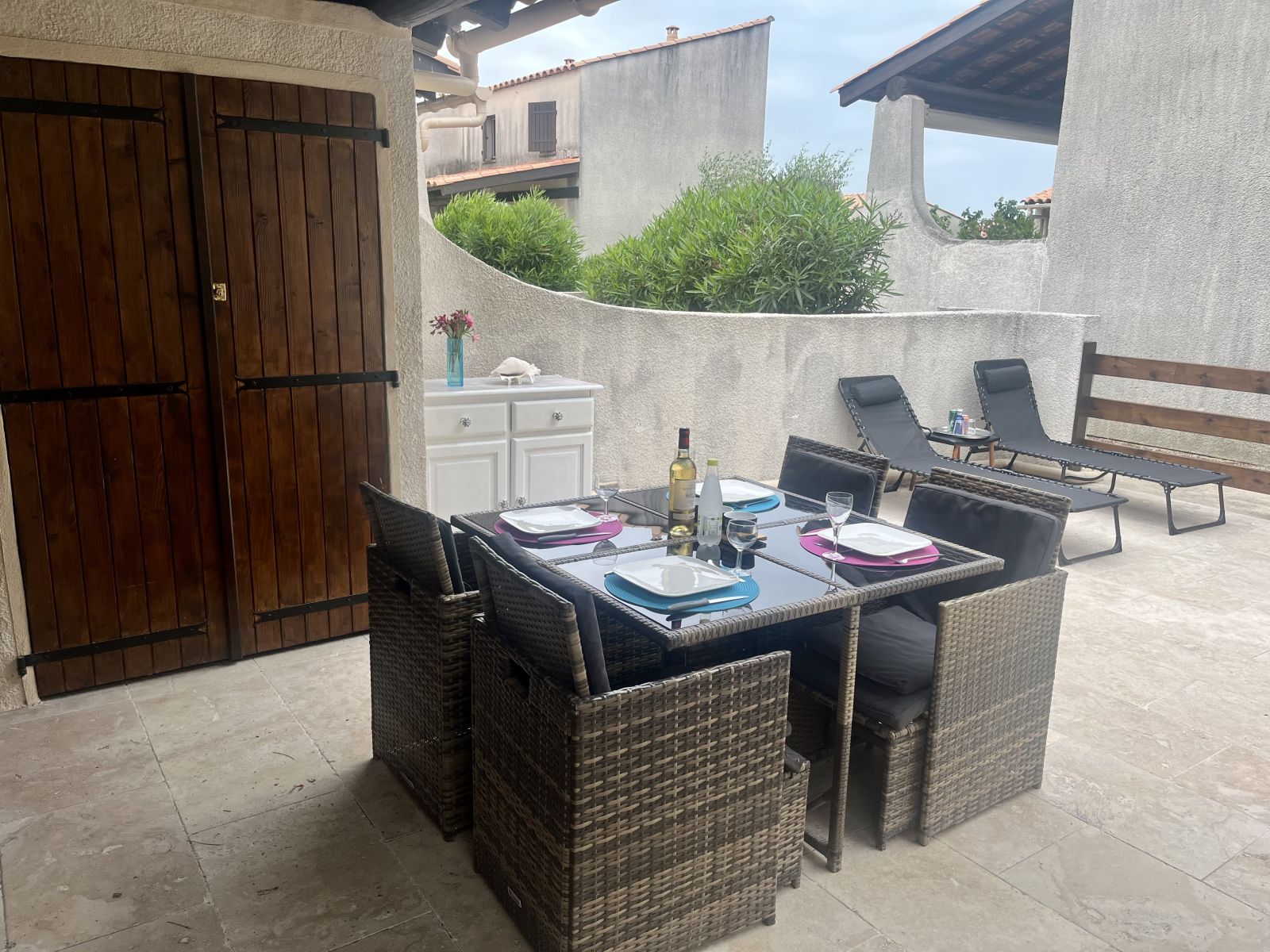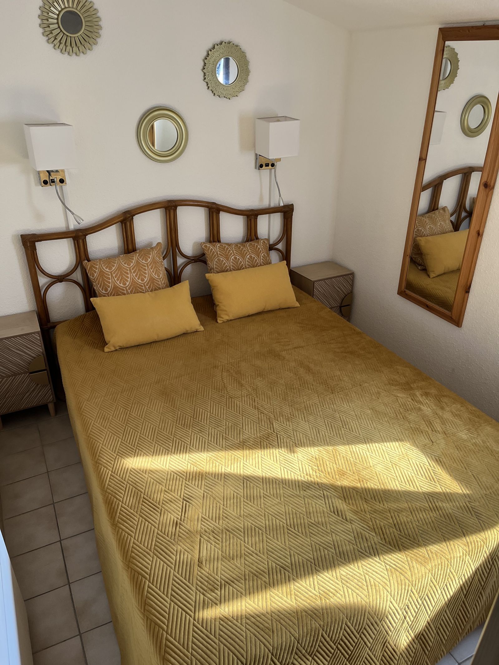 Elle se compose au rez-de-chaussée d'un séjour avec coin cuisine tout équipé et cabinet de toilette. A l'étage se trouve une salle d'eau avec WC, une chambre avec 1 lit en 140 cm et une deuxième chambre avec 1 lit en 140 cm. Elle est entièrement climatisée et refaite à neuf avec moustiquaires et une place de stationnement privatisée. Emplacement idéal à 500 m à pied du centre pour commerces, resto, plages.