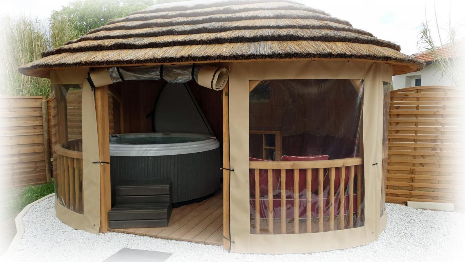 Équipements communs à 3 gîtes et une roulotte : parking sur la propriété fermée - grande terrasse couverte avec mobilier bois - Jacuzzi dans une cabane d'aspect traditionnel (accès gratuit) pour 6 personnes, donnant sur un petit jardin. Lave linge - Barbecue maçonné. Cour fleurie avec fontaine. Ménage inclus. Draps et linge de toilette en supplément.
