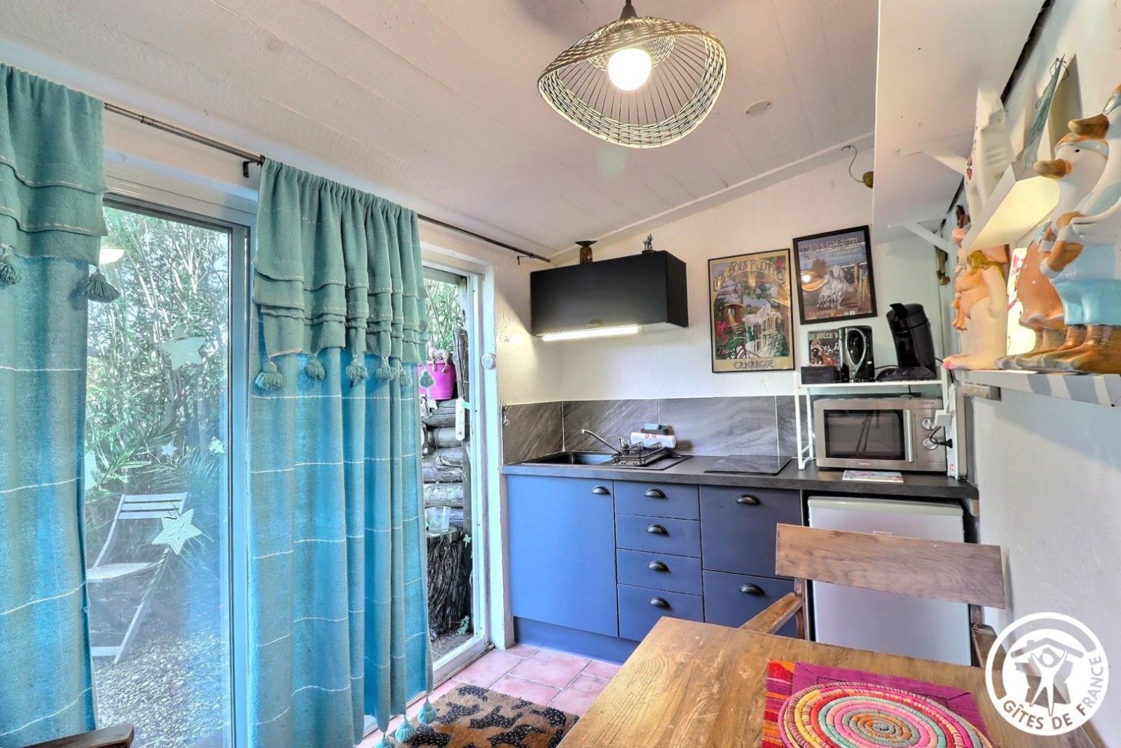 - La cuisine avec espace repas pour 2 personnes, kitchenette équipée avec bouilloire, cafetière à dosettes Senseo, micro-ondes, plaque 2 feux induction, petit réfrigérateur table-top et grille-pain.