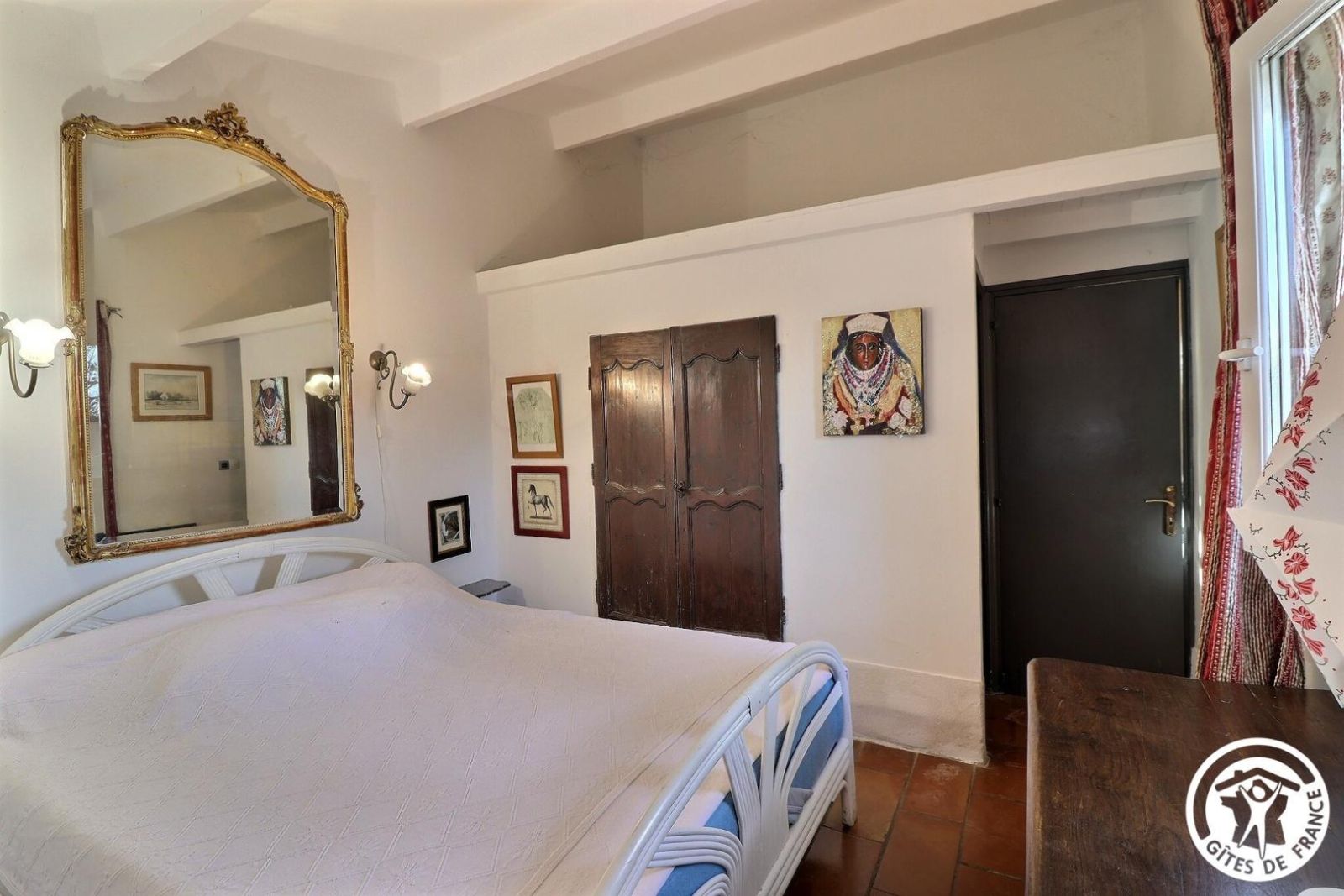 - La chambre avec un lit 2 personnes 160x200cm, placard penderie, table, lampe d'appoint, petite TV écran plat connectée fixée au mur et grand miroir au-dessus du lit.