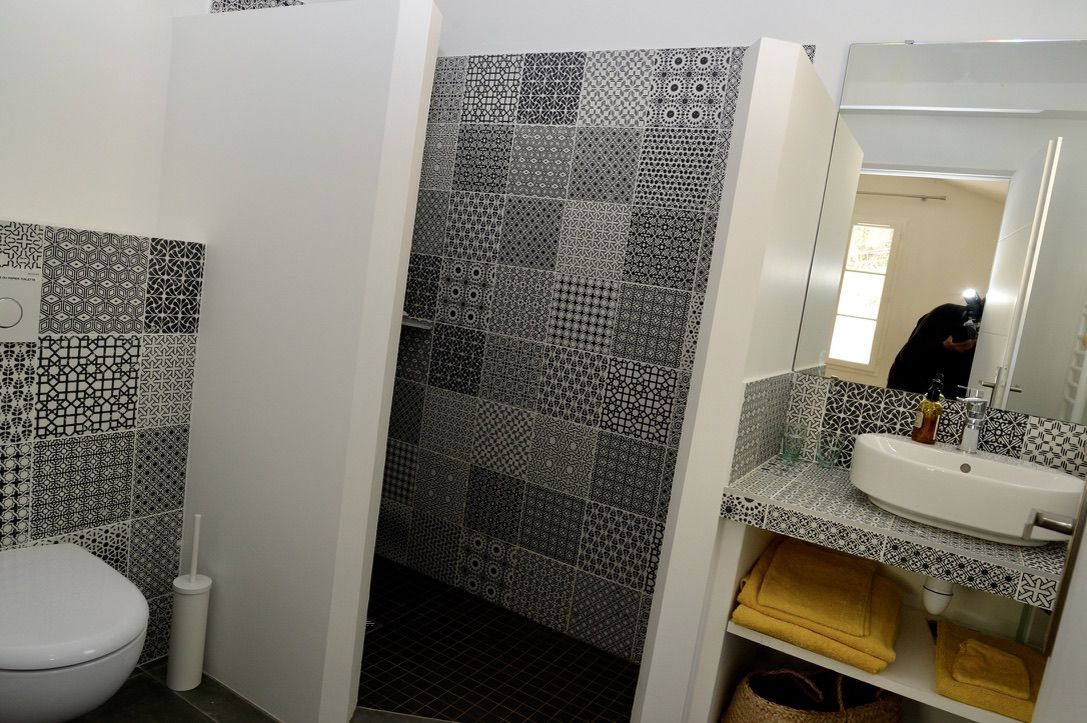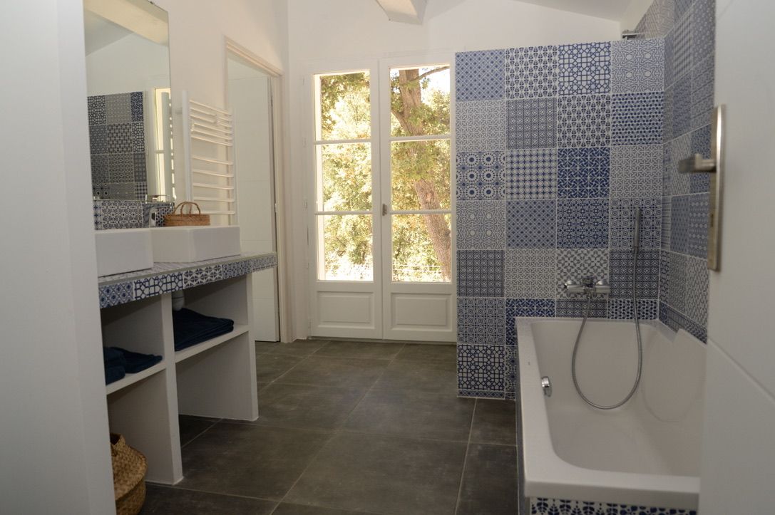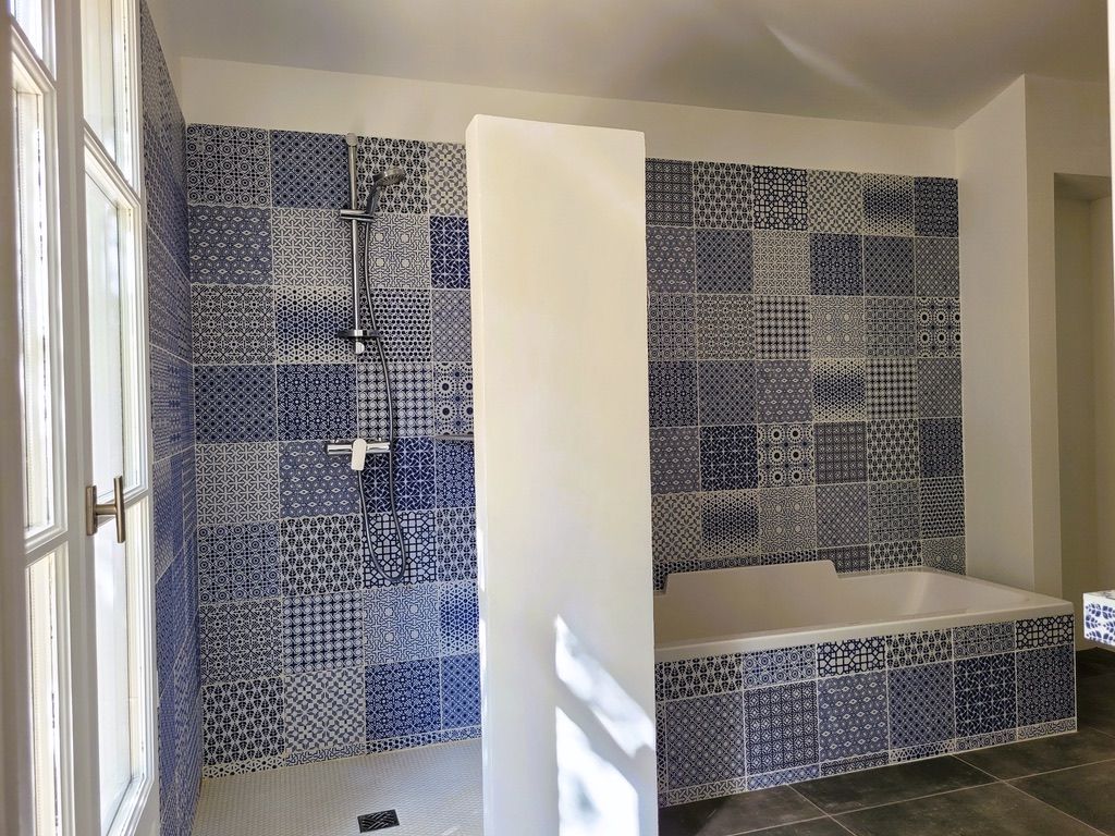 - salle de bains avec double accès par les deux chambres, composée d'une baignoire et d'une douche à l'italienne, double vasque, porte-serviettes chauffant, miroir chauffant et WC A l'extérieur :